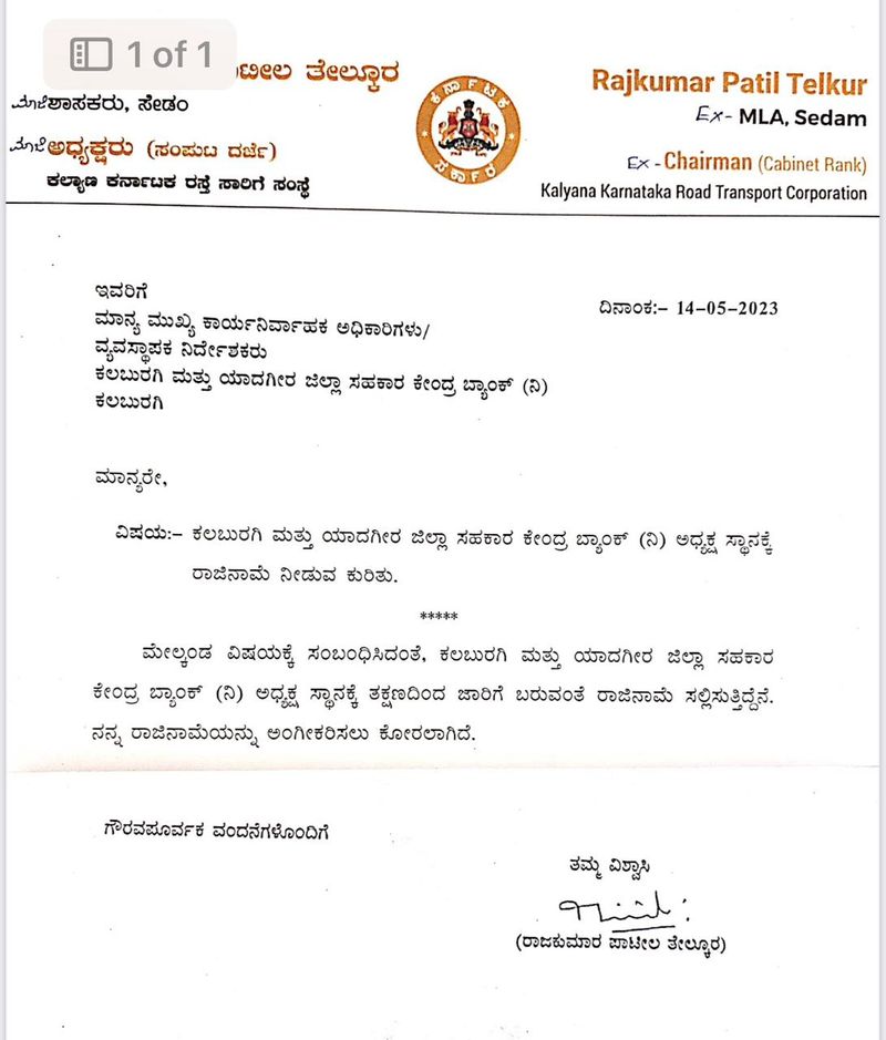 ಬ್ಯಾಂಕ್ನ ಮುಖ್ಯ ಕಾರ್ಯನಿರ್ವಾಹಕ ಅಧಿಕಾರಿಗಳಿಗೆ ರಾಜೀನಾಮೆ ಸಲ್ಲಿಸಿದ್ದು, ತಕ್ಷಣ ಜಾರಿಗೆ ಬರುವಂತೆ ರಾಜೀನಾಮೆ ಅಂಗೀಕರಿಸುವಂತೆ ಕೋರಿದ ರಾಜಕುಮಾರ ಪಾಟೀಲ್ ತೇಲ್ಕೂರ