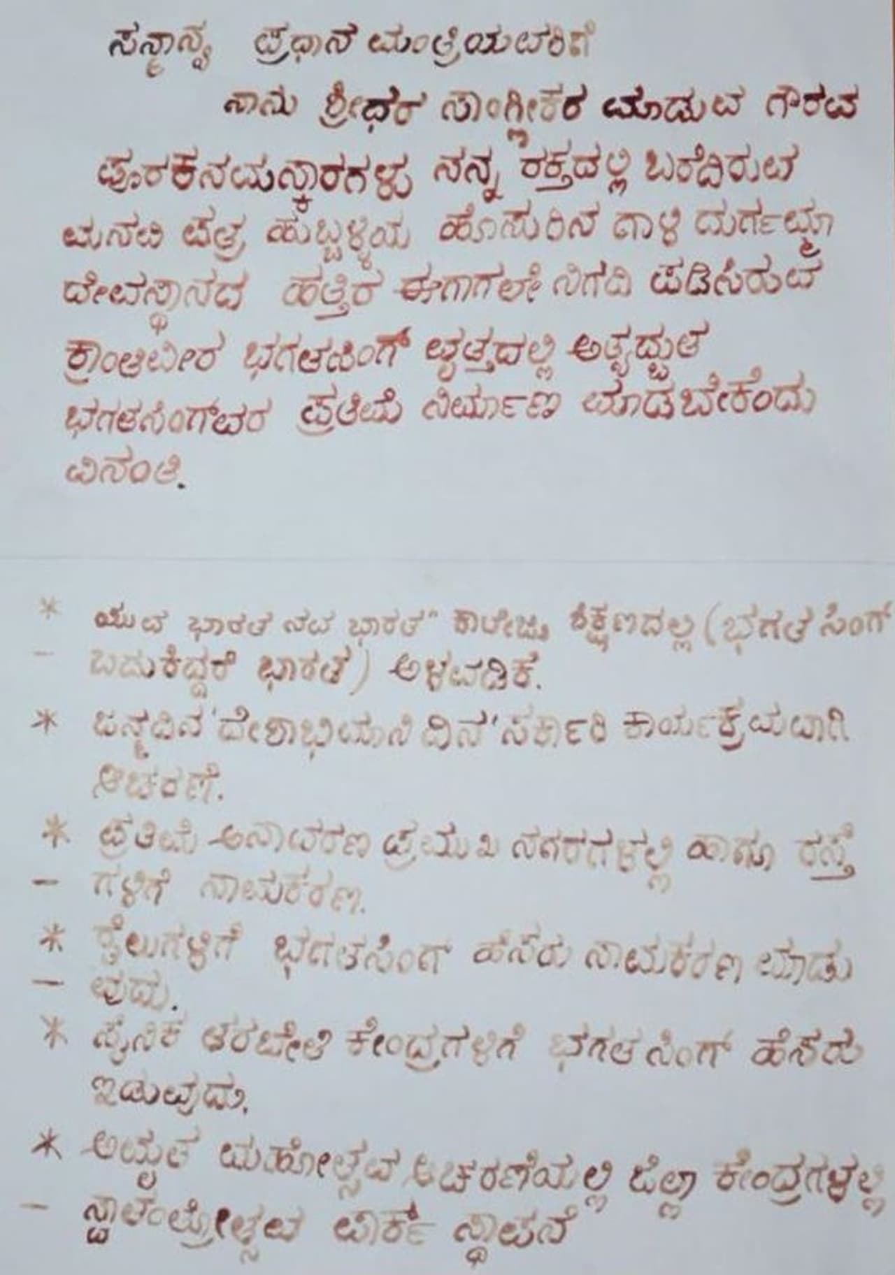 ಹೌದು, ಹೀಗೆ ತನ್ನ ರಕ್ತದಲ್ಲಿ ಪತ್ರ ಬರೆದ ವ್ಯಕ್ತಿ ಹೆಸರು ಶ್ರೀಧರ್ ಸಾಂಗ್ಲಿಕರ್. ಹುಬ್ಬಳ್ಳಿಯ(Hubballi) ಭಗತ್ ಸಿಂಗ್(Bhagat Singh) ಯುವಕ ಮಂಡಳದ ಅಧ್ಯಕ್ಷರೂ ಆಗಿರುವ ಶ್ರೀಧರ ಸಾಂಗ್ಲಿಕರ್, ತಮ್ಮ ಜನ್ಮದಿನದ ಪ್ರಯುಕ್ತವಾಗಿ ಪ್ರಧಾನ ಮಂತ್ರಿ ನರೇಂದ್ರ ಮೋದಿಯವರಿಗೆ ಪತ್ರ ಬರೆದಿದ್ದಾರೆ. ಹುಬ್ಬಳ್ಳಿಯ ಹೃದಯ ಭಾಗದಲ್ಲಿರುವ ಹೊಸೂರಿನ ಗಾಳಿ ದುರ್ಗಮ್ಮ ದೇವಿಯ ದೇವಸ್ಥಾನದ ಹತ್ತಿರದಲ್ಲಿರುವ ಭಗತ್ ಸಿಂಗ್ ಸರ್ಕಲ್ನಲ್ಲಿ ದೊಡ್ಡ ಪ್ರಮಾಣದ ಸ್ವಾತಂತ್ರ್ಯ ಹೋರಾಟಗಾರ ಭಗತ್ ಸಿಂಗ್ ಅವರ ಪುತ್ಥಳಿಯನ್ನು(Statue) ಸ್ಥಾಪಿಸುವಂತೆ ಮನವಿ ಮಾಡಿದ್ದಾರೆ.