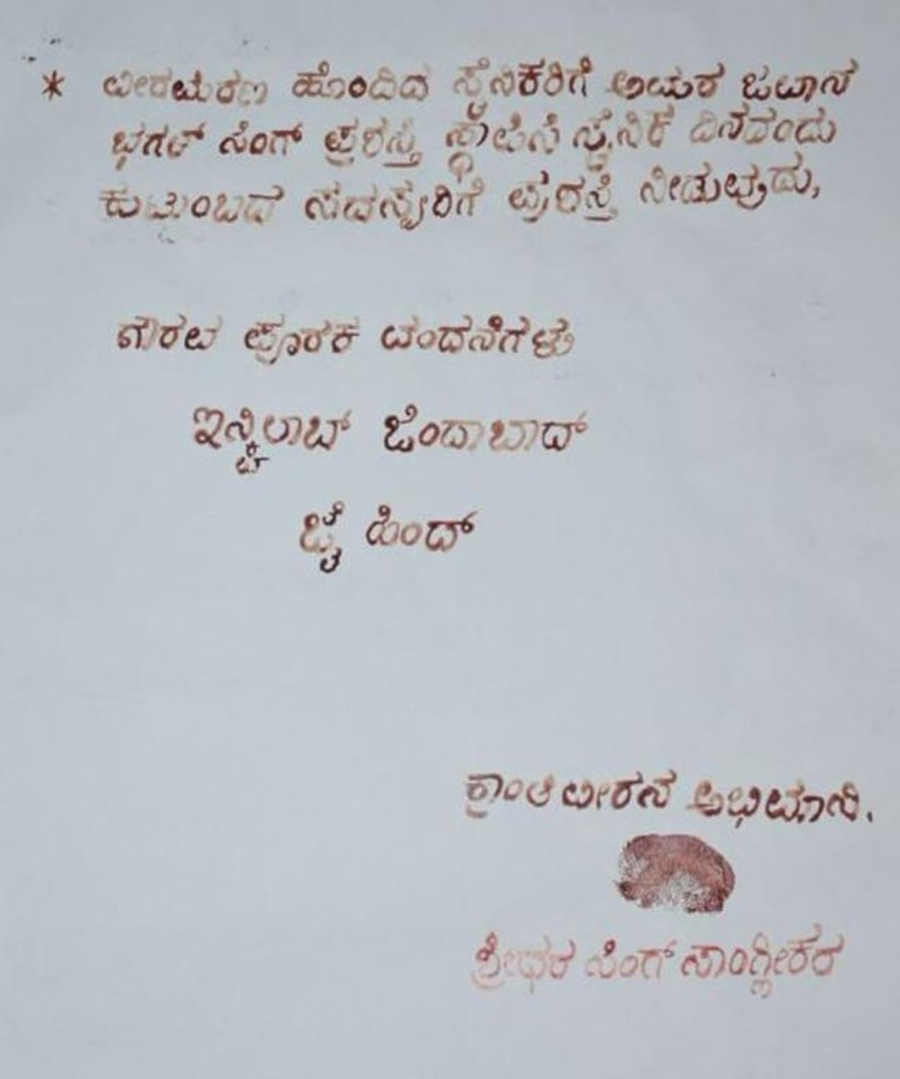 ಅಂದ ಹಾಗೆ ಇಂದು ಈ ಯುವ ಮುಖಂಡನ ಹುಟ್ಟುಹಬ್ಬ. ಇದೇ ಕಾರಣಕ್ಕೆ ಭಗತ್ ಸಿಂಗ್ ಪುತ್ಥಳಿ ಸ್ಥಾಪನೆಗೆ ಪಣತೊಟ್ಟು ಈ ರೀತಿ ರಕ್ತದಲ್ಲಿ ಎರಡು ಪುಟಗಳ ಪತ್ರ ಬರೆದಿದ್ದಾರೆ. ಕ್ರಾಂತಿವೀರ ಭಗತ್ ಸಿಂಗ್ ಅವರ ಮೇಲಿನ ಅಪಾರ ಅಭಿಮಾನದಿಂದ ಹಾಗೂ ಮುಂದಿನ ಪೀಳಿಗೆಗೆ ಭಗತ್ ಸಿಂಗ್ ಅವರ ಪರಿಚಯಿಸುವ ಸದುದ್ದೇಶದಿಂದ ಇಂತಹದೊಂದು ಕಾರ್ಯಕ್ಕೆ ಮುಂದಾಗಿದ್ದಾರೆ ಶ್ರೀಧರಸಿಂಗ ಸಾಂಗ್ಲಿಕರ.