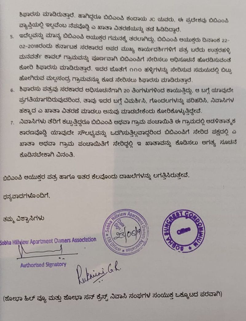 2016ರಲ್ಲಿ ಶೋಭಾ ಹಿಲ್ವ್ಯೂನಲ್ಲಿ ಇತಿಹಾಸದಲ್ಲಿಯೇ ಮೊದಲು ಎನ್ನಬಹುದಾದ ಖಾತಾ ಮೇಳವೊಂದನ್ನು ಆಯೋಜಿಸಲಾಗಿತ್ತು. ಆಗಲೇ ಪರಿಹಾರ ಕಂಡುಕೊಳ್ಳಲು ಅವಿರತ ಯತ್ನವೂ ನಡೆಯಿತು. 2018ರಲ್ಲಿ ಬಿಬಿಎಂಪಿ ಆಯುಕ್ತರೂ ಈ ಪ್ರದೇಶವನ್ನು ಬಿಬಿಎಂಪಿಗೆ ಸೇರಿಸಿ ಎಂದು ಆಗ್ರಹಿಸಿ... ಸರ್ಕಾರಕ್ಕೆ ಪತ್ರ ಬರೆದರು. ಆದರೆ 2018ರಿಂದಲೂ ಈ ಸಂಬಂಧ ಯಾವ ಉತ್ತರವೂ ಬಂದಿಲ್ಲ. ಇದೀಗ ಕೇಂದ್ರ ಸಚಿವ ಸದಾನಂದ ಗೌಡರಿಗೂ ನಿವಾಸಿಗಳು ಮನವಿ ಸಲ್ಲಿಸಿದ್ದಾರೆ.