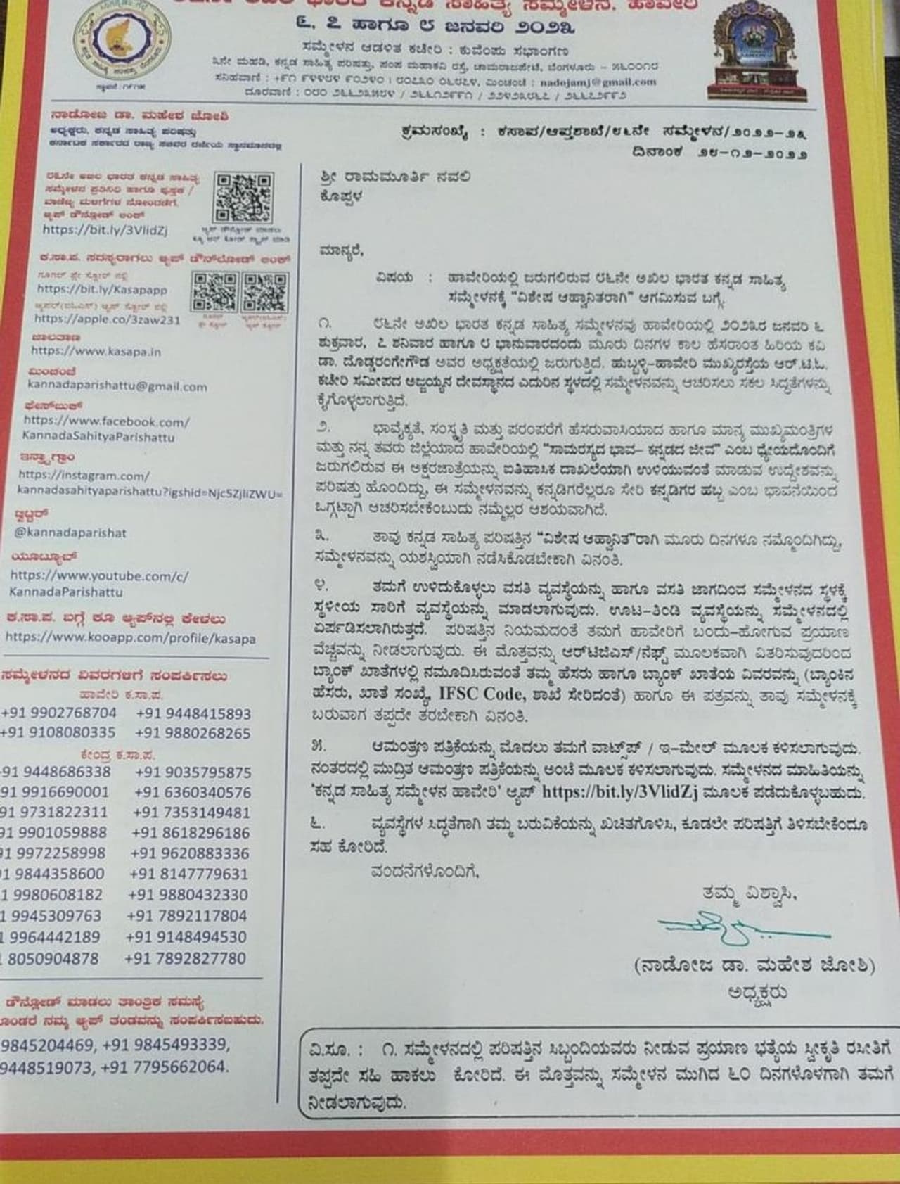 ಈ ಕುರಿತು ರಾಮಮೂರ್ತಿ ನವಲಿ ಅವರಿಗೆ ಡಾ.ಮಹೇಶ ಜೋಷಿ ಪತ್ರ ಬರೆದಿದ್ದು ಸಾಹಿತ್ಯ ಸಮ್ಮೇಳನಾದ್ಯಕ್ಷರಾಗಿ ಹಿರಿಯ ಕವಿ ಡಾ.ದೊಡ್ಡರಂಗೇಗೌಡ ಅವರ ಅಧ್ಯಕ್ಷತೆಯಲ್ಲಿ ಮೂರು ದಿನಗಳ ಕಾಲ ನಡೆಯುವ 86 ನೇ ಅಖಿಲ ಭಾರತ ಕನ್ನಡ ಸಾಹಿತ್ಯ ಸಮ್ಮೇಳನದಲ್ಲಿ ಭಾಗವಹಿಸುವಂತೆ ಕೋರಿದ್ದಾರೆ.