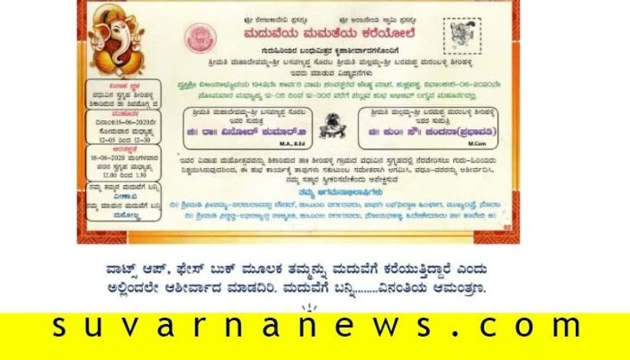 ಪ್ರೀತಿಯನ್ನೂ ಕೊರೋನಾ ಸಂಬಂಧಿಸಿದ ಪದಗಳನ್ನೂ ಬಳಸಿಕೊಂಡು ಆಕರ್ಷಕವಾದ ವಿವಾಹ ಕರೆಯೋಲೆ ಸಿದ್ದಪಡಿಸಿದ್ದು ಈಗ ಸೋಷಿಯಲ್ ಮೀಡಿಯಾದಲ್ಲಿ ವೈರಲ್ ಆಗುತ್ತಿದೆ. ಅಂತೂ ಕೊರೋನಾದಿಂದ ವಿಭಿನ್ನ ಕ್ರಿಯೇಟಿವಿಟಿಗಳು ಹುಟ್ಟಿಕೊಳ್ಳುತ್ತಿರುವುದು ಸತ್ಯ.
