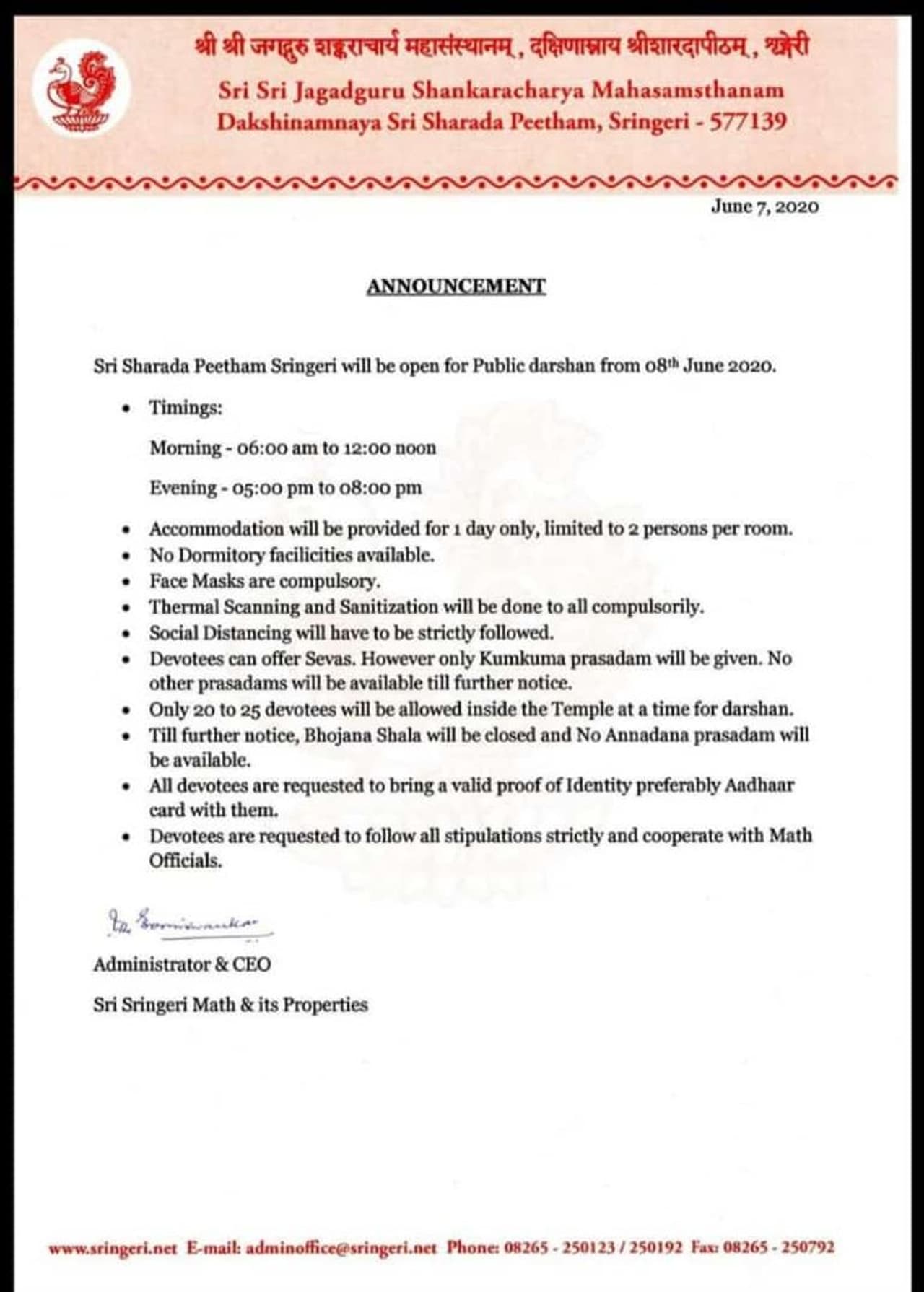 ಈ ಸಂಬಂಧ ಪ್ರಕಟಣೆ ಹೊರಡಿಸಿರುವ ದೇವಸ್ಥಾನದ ಆಡಳಿತ ಮಂಡಳಿ ಇಂದಿನಿಂದ(ಸೋಮವಾರ) ಶೃಂಗೇರಿ ಶಾರದಾಂಬೆ ದೇವಸ್ಥಾನ ಭಕ್ತರ ದರ್ಶನಕ್ಕೆ ಮುಕ್ತವಾಗಿದೆ. ಬೆಳಿಗ್ಗೆ 6ಗಂಟೆಯಿಂದ ಅಪರಾಹ್ನ 12 ರವರೆಗೆ ಹಾಗೂ ಸಂಜೆ 5 ರಿಂದ 8 ರವರೆಗೆ ತೆರೆಯಲಿದೆ.
