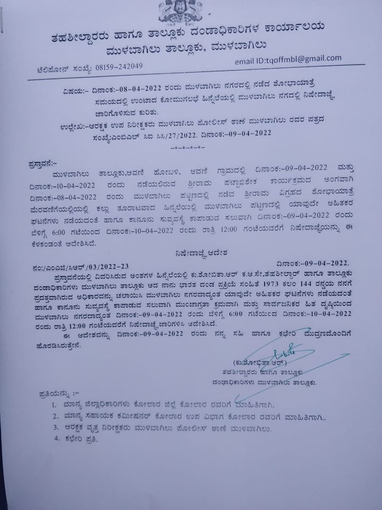 ಸದ್ಯ ಕೋಲಾರ ಜಿಲ್ಲೆ ಮುಳಬಾಗಿಲು ನಗರದಲ್ಲಿ ಮೂರು ದಿನಗಳ ಕಾಲ ನಿಷೇದಾಜ್ಞೆ ಜಾರಿ ಮಾಡಲಾಗಿದ್ದು,ಮೂರು ದಿನಗಳ ಕಾಲ 144 ಸೆಕ್ಷನ್ ಜಾರಿ ಮಾಡಲಾಗಿದೆ. ಶ್ರೀರಾಮನವಮಿ ಹಬ್ಬದ ಹಿನ್ನೆಲೆ ಮುಂಜಾಗ್ರತಾ ಕ್ರಮವಾಗಿ ಜಿಲ್ಲಾಧಿಕಾರಿ ಈ ಆದೇಶ ಹೊರಡಿಸಿದ್ದಾರೆ. ಮಧ್ಯರಾತ್ರಿ 1.30 ರಿಂದ ಕೋಲಾರದಲ್ಲೇ ಐಜಿಪಿ ಚಂದ್ರಶೇಖರ್ ಮೊಕ್ಕಾಂ ಹೂಡಿ ಕ್ಷಣ ಕ್ಷಣದ ಮಾಹಿತಿ ಪಡೆದುಕೊಳ್ತಿದ್ದಾರೆ.