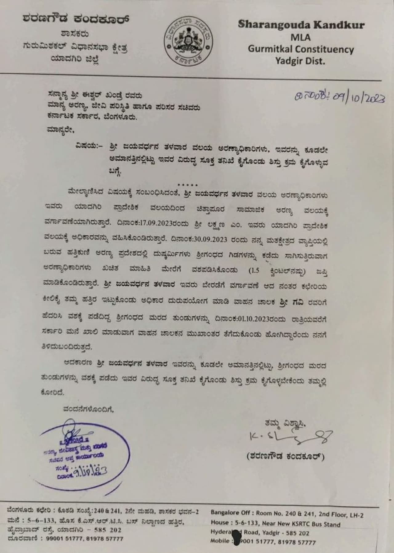 ಯಾದಗಿರಿಯಿಂದ ಇತ್ತೀಚೆಗಷ್ಟೇ ಚಿತ್ತಾಪುರ ಸಾಮಾಜಿಕ ಅರಣ್ಯ ವಲಯಕ್ಕೆ ವರ್ಗಾವಣೆಯಾಗಿರುವ ಜಯವರ್ಧನ ತಳವಾರ ಅವರು ಸರ್ಕಾರಿ ಮನೆ ಖಾಲಿ ಮಾಡುವಾಗ ವಾಹನ ಚಾಲಕ ಗವಿ ಎನ್ನುವವರಿಗೆ ಬೆದರಿಸಿ, ಶ್ರೀಗಂಧದ ತುಂಡುಗಳನ್ನು ತೆಗೆದುಕೊಂಡು ಹೋಗಿದ್ದಾರೆ. ತನಿಖೆ ನಡೆಸಿ, ಅಧಿಕಾರಿ ಮೇಲೆ ಕ್ರಮ ಕೈಗೊಳ್ಳುವಂತೆ ಶಾಸಕ ಕಂದಕೂರು ಸಚಿವರಿಗೆ ಬರೆದ ಪತ್ರದಲ್ಲಿ ಕೋರಿದ್ದಾರೆ.