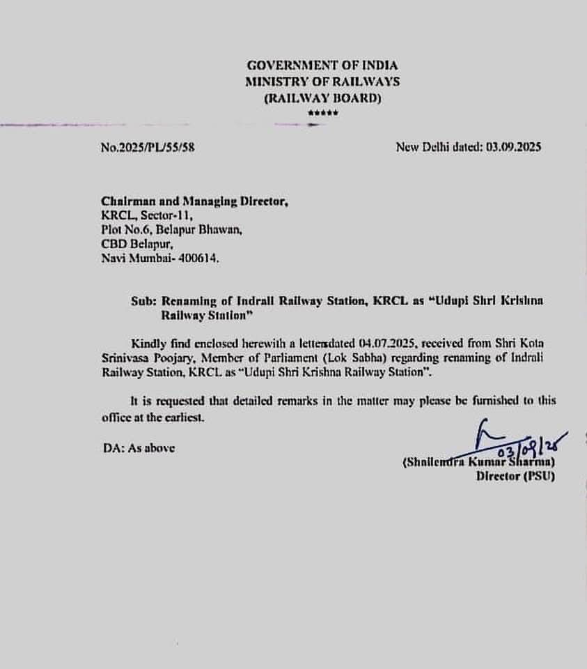 Udupi Railway Station to be Renamed After Sri Krishna ಉಡುಪಿಯ ಇಂದ್ರಾಳಿ ರೈಲು ನಿಲ್ದಾಣವು ಶೀಘ್ರದಲ್ಲೇ 'ಉಡುಪಿ ಶ್ರೀ ಕೃಷ್ಣ ರೈಲು ನಿಲ್ದಾಣ' ಎಂದು ಮರುನಾಮಕರಣಗೊಳ್ಳಬಹುದು. ಸಂಸದ ಕೋಟ ಶ್ರೀನಿವಾಸ್ ಪೂಜಾರಿಯವರು ಈ ಪ್ರಸ್ತಾವನೆಯನ್ನು ರೈಲ್ವೆ ಸಚಿವಾಲಯಕ್ಕೆ ಸಲ್ಲಿಸಿದ್ದಾರೆ.