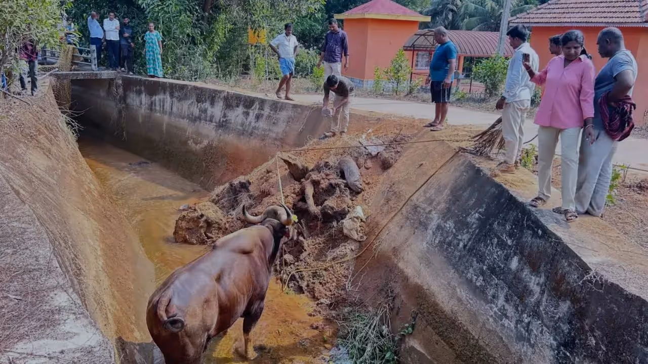 ಉಡುಪಿಯ ಕುಂದಾಪುರ ಬಳಿ ವಾರಾಹಿ ಕಾಲುವೆಗೆ ಬಿದ್ದಿದ್ದ ಬೃಹತ್ ಕಾಡುಕೋಣವನ್ನು, ಅರಣ್ಯ ಇಲಾಖೆ ಮತ್ತು ಸ್ಥಳೀಯರು ಸತತ 20 ಗಂಟೆಗಳ ಕಾರ್ಯಾಚರಣೆ ನಡೆಸಿ ಯಶಸ್ವಿಯಾಗಿ ರಕ್ಷಿಸಿದ್ದಾರೆ. ಜೆಸಿಬಿ ಬಳಸಿ ಮಣ್ಣಿನ ಇಳಿಜಾರು ನಿರ್ಮಿಸಿ, ಪ್ರಾಣಿಯನ್ನು ಸುರಕ್ಷಿತವಾಗಿ ಕಾಡಿಗೆ ಮರಳುವಂತೆ ಮಾಡಲಾಯಿತು.