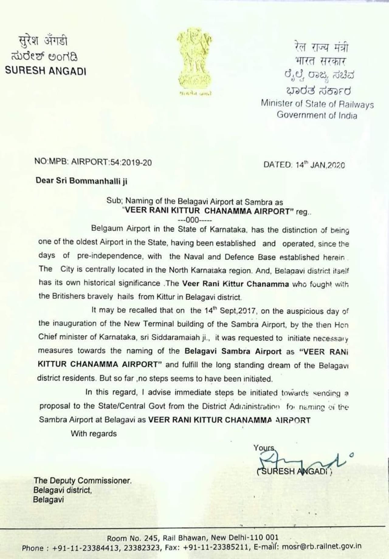 ಸಾಂಬ್ರಾ ವಿಮಾನ ನಿಲ್ದಾಣಕ್ಕೆ ರಾಣಿ ಚನ್ನಮ್ಮನ ಹೆಸರಿಡುವಂತೆ ಶಿಫಾರಸು ಪತ್ರವೊಂದು ಸಾಮಾಜಿಕ ಜಾಲತಾಣಗಳಲ್ಲಿ ವೈರಲ್| ಬೆಳಗಾವಿ ಏರ್ಪೋರ್ಟ್ಗೆ ಚನ್ನಮ್ಮ ಹೆಸರಿಡಲು ಬೆಳಗಾವಿ ಜಿಲ್ಲಾಡಳಿತಕ್ಕೆ ಕೇಂದ್ರ ಸಚಿವ ಸುರೇಶ ಅಂಗಡಿ ಪತ್ರ|