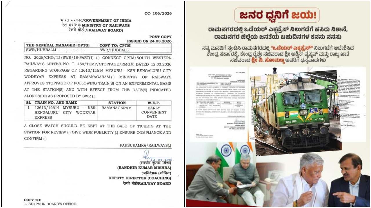 ನನ್ನ ಮನವಿಗೆ ಸ್ಪಂದಿಸಿ, ರಾಮನಗರದಲ್ಲಿ ಒಡೆಯರ್ ಎಕ್ಸಪ್ರೆಸ್ ನಿಲುಗಡಗೆ ಅನುಮೋದನೆ ನೀಡಿದ ಕೇಂದ್ರ ರೈಲ್ವೇ ಸಚಿವರಾದ Ashwini Vaishnaw, ರೈಲ್ವೇ ರಾಜ್ಯ ಖಾತೆ ಸಚಿವರಾದ ವಿ ಸೋಮಣ್ಣ ಹಾಗೂ ಈ ಕಾರ್ಯದಲ್ಲಿ ಕೈಜೋಡಿಸಿದ ಎಲ್ಲಾ ಸಂಬಂಧಪಟ್ಟ ಅಧಿಕಾರಿಗಳಿಗೆ ಹೃತ್ಪೂರ್ವಕ ಧನ್ಯವಾದಗಳನ್ನು ತಿಳಿಸುತ್ತೇನೆ.