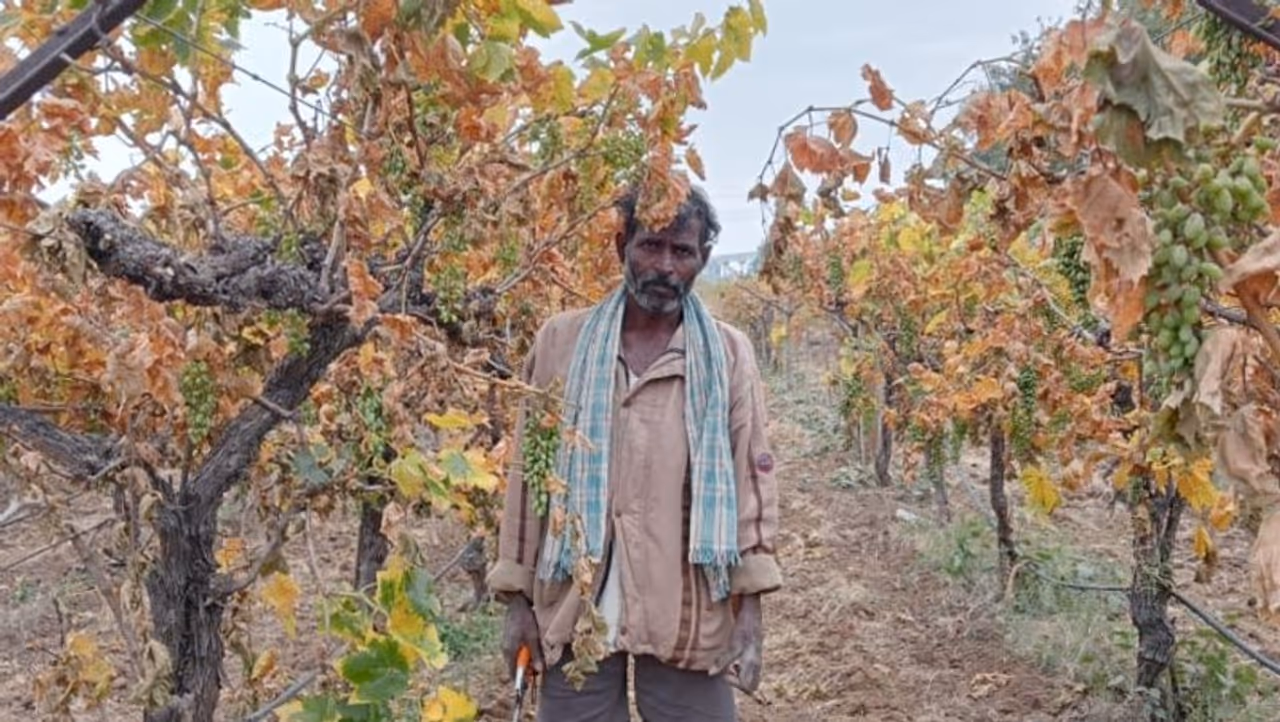 ಕೈಗೆ ಬಂದಿದ್ದ ಬೆಳೆ ಬಾಯಿಗೆ ಬರಲಿಲ್ಲ ಎನ್ನುವಂತೆ ದ್ರಾಕ್ಷಿ ಬೆಳೆ ನಷ್ಟದ್ರಾಕ್ಷಿ ಬಳ್ಳಿ ಹಳದಿ ಬಣ್ಣಕ್ಕೆ ತಿರುಗಿದ್ದು, ಮುದುರಿಕೊಂಡು ಬಿದ್ದಿದೆದ್ರಾಕ್ಷಿ ಬೆಳೆಗಾಗಿ ಮಾಡಿದ್ದ 5 ಲಕ್ಷ ರೂ. ಸಾಲ ತೀರಿಸಲು ದಾರಿಯೇ ಕಾಣಲಿಲ್ಲಮನೆಯ ಮಗನಂತೆ ಬೆಳೆಸಿದ್ದ ದ್ರಾಕ್ಷಿ ಬೆಳೆಯನ್ನು ಕೈಯಾರೆ ಕೊಂದೆನೆಂಬ ಹತಾಶೆ
