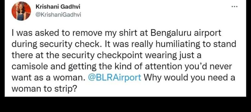 ಆಗ ಉಳಿದ ಟ್ರಾವೆಲರ್ಸ್ ಆಕೆಯನ್ನು ದಿಟ್ಟಿಸಿ ನೋಡಿರುತ್ತಾರೆ. ಇದ್ರಿಂದ ನನಗೆ ಅವಮಾನ ಆಗಿದೆ ಅಂತ ಕ್ರಿಶಾನಿ ಗಡವಿ ಟ್ವೀಟ್ ಮಾಡಿದ್ದಾರೆ. ಯುವತಿ ಟ್ವೀಟ್ಗೆ ವಿಮಾನ ನಿಲ್ದಾಣದ ಟೀಂ ಸ್ಪಂದಿಸಿದೆ. ಈ ಘಟನೆ ಬಗ್ಗೆ ನಮಗೆ ಕೂಡ ಬೇಸರ ತಂದಿದೆ. ಈ ವಿಚಾರದ ಬಗ್ಗೆ ತನಿಖೆಯನ್ನ ಮಾಡ್ತೀವಿ ಅಂತಾ ಕೆಂಪೇಗೌಡ ಅಂತರಾಷ್ಟ್ರೀಯ ವಿಮಾನ ನಿಲ್ದಾಣದ ಅಧಿಕೃತ ಖಾತೆಯಿಂದ ಟ್ವೀಟ್ ಮಾಡಿದೆ.