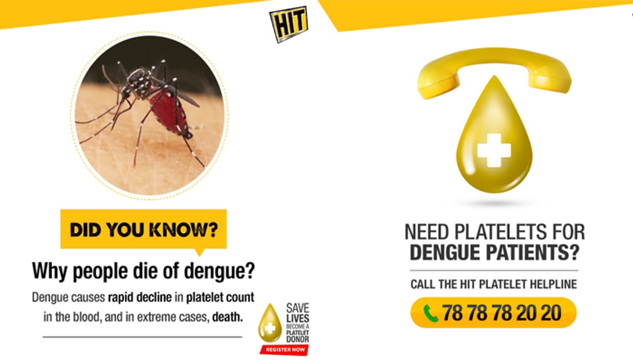 ಡೆಂಗ್ಯೂ ವೈರಸ್, ರಕ್ತದಲ್ಲಿರುವ ರಕ್ತಕಣಗಳನ್ನು ನಾಶಮಾಡುವ ಮೂಲಕ ಆಂತರಿಕ ರಕ್ತಸ್ರಾವ ಹಾಗೂ ಇನ್ನಿತರ ಜಟಿಲ ಸಮಸ್ಯೆಗಳನ್ನು ತಂದೊಡ್ಡುತ್ತದೆ. ಅಂತಹ ಕ್ಲಿಷ್ಟಕರ ಸಂದರ್ಭದಲ್ಲಿ ರೋಗಿಗಳ ಜೀವ ಉಳಿಸಲು ರಕ್ತಕಣ ದಾನಿಗಳ ಅವಶ್ಯಕತೆ ಹಾಗೂ ಲಭ್ಯತೆ ಬಹಳ ಅನಿವಾರ್ಯವಾಗಿರುತ್ತದೆ. ಇಂತಹ ಸನ್ನಿವೇಶದಲ್ಲಿ ಹಿಟ್ ರಕ್ತಕಣ ಸಹಾಯವಾಣಿ- 78 78 78 20 20- ಆಪದ್ಭಾಂದವನಂತಿದೆ. ಡೆಂಗ್ಯೂ ರೋಗಿಗಳಿಗೆ ರಕ್ತಕಣಗಳ ಅವಶ್ಯಕತೆಯಿದ್ದಾಗ ಈ ಸಹಾಯವಾಣಿಗೆ ಕರೆ ಮಾಡಬಹುದು.