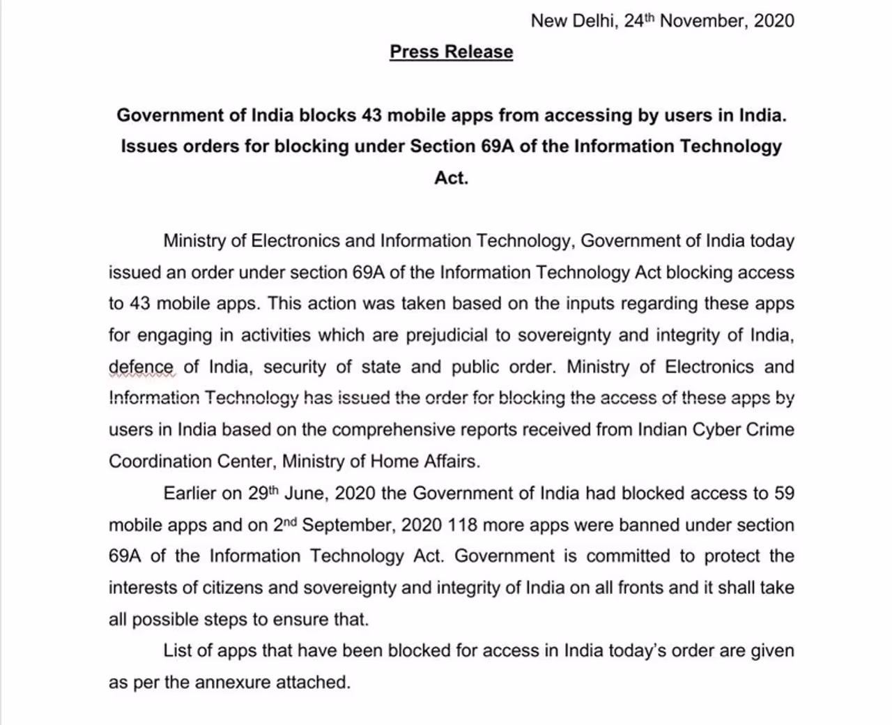 ಆಲಿಬಾಬ, ಮ್ಯಾಂಗೋ ಟಿವಿ, ವಿ ಟಿವಿ, ವಿ ವರ್ಕ್ ಫಾರ್ ಚೀನಾ, ಆಲಿ ಎಕ್ಸ್ಪ್ರೆಸ್, ಸ್ನಾಕ್ ವಿಡಿಯೋ, ಕ್ಯಾಮ್ ಕಾರ್ಡ್, ವಿ ಡೇಟ್, ಡಿಂಗ್ ಟಾಕ್, ಹ್ಯಾಪಿ ಫಿಶ್ ಸೇರಿದಂತೆ ಚೀನಾದ 43 ಆ್ಯಪ್ ಬ್ಯಾನ್ ಮಾಡಲಾಗಿದೆ.