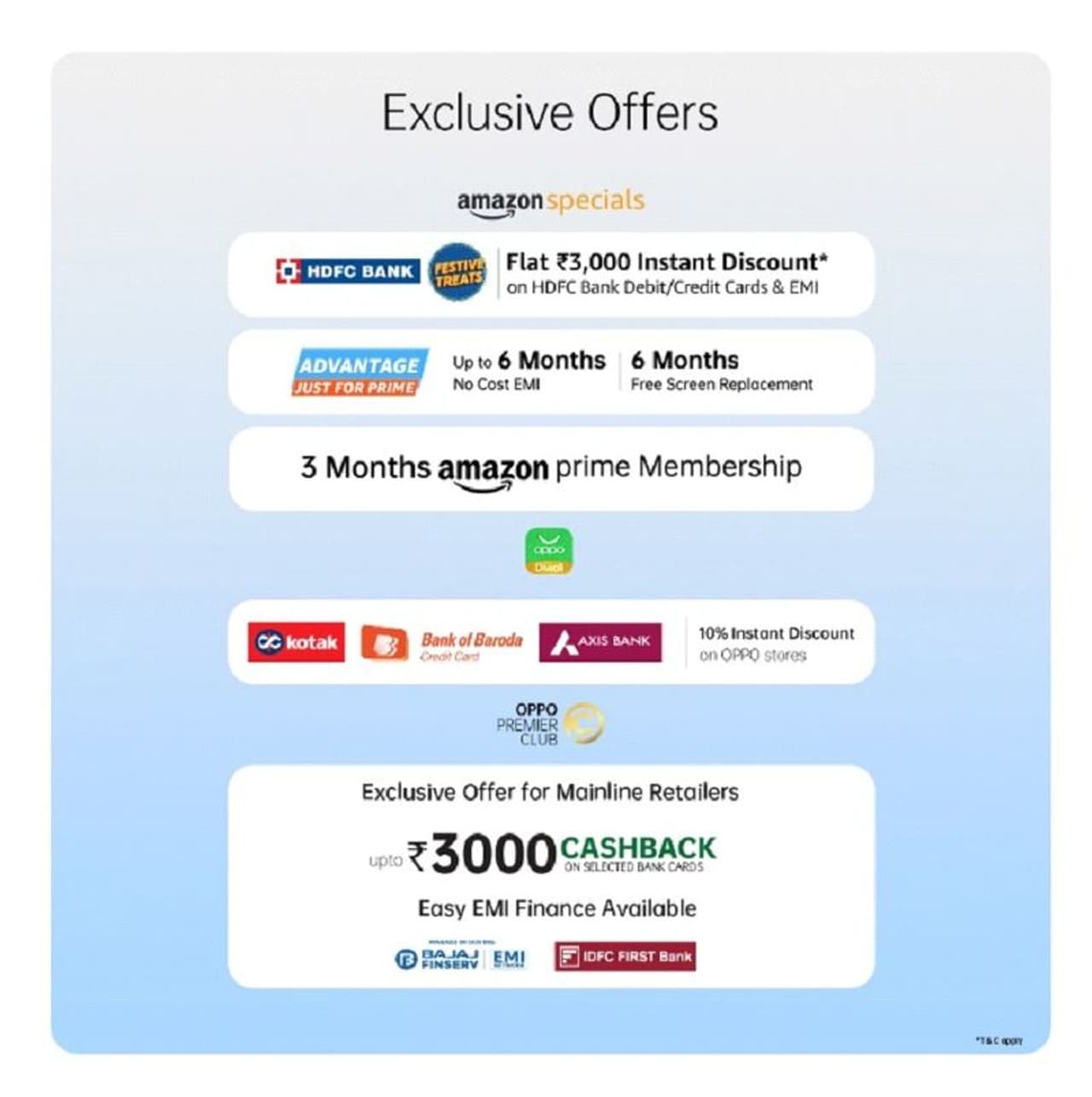 OPPO E ಅಂಗಡಿಯಿಂದ ಫೋನ್ ಖರೀದಿಸುವ ಗ್ರಾಹಕರಿಗೆ ಕೋಟಕ್, ಬ್ಯಾಂಕ್ ಆಫ್ ಬರೋಡಾ ಮತ್ತು ಆಕ್ಸಿಸ್ ಬ್ಯಾಂಕ್ನೊಂದಿಗೆ 10% ತ್ವರಿತ ರಿಯಾಯಿತಿ ಮತ್ತು 3 ತಿಂಗಳವರೆಗೆ ನೋ ಕಾಸ್ಟ್ EMI ಕೊಡುಗೆ ಪಡೆಯಲಿದ್ದೀರಿ.