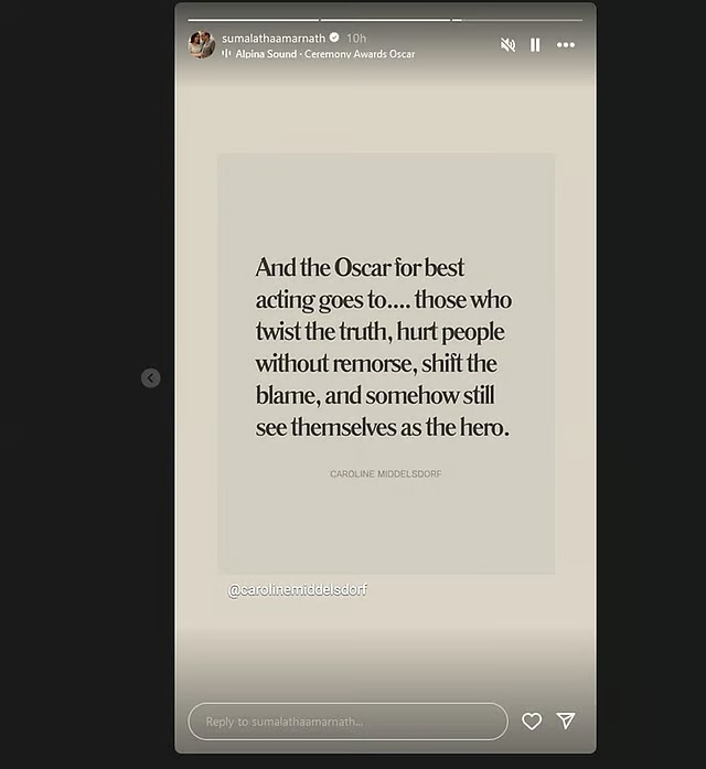 ಇನ್ಸ್ಟಾಗ್ರಾಮ್ನಲ್ಲಿ ದರ್ಶನ್ ಅನ್ಫಾಲೋ ಮಾಡಿರುವ ವಿಚಾರ ಮಾಧ್ಯಮಗಳಲ್ಲಿ ಬಿತ್ತರವಾದ ಬೆನ್ನಲ್ಲಿಯೇ ಸುಮಲತಾ ಮಾರ್ಮಿಕವಾಗಿ ಪೋಸ್ಟ್ ಹಾಕಿದ್ದಾರೆ. ಇಂಗ್ಲೀಷ್ ಸಾಲುಗಳನ್ನು ಹಾಕಿ ದರ್ಶನ್ಗೆ ತಿರುಗೇಟು ನೀಡಿದ್ದಾರೆ. 'ಅತ್ಯುತ್ತಮ ನಟ ಆಸ್ಕರ್ ಅವಾರ್ಡ್ ಯಾರಿಗೆ ಹೋಗುತ್ತದೆ ಎಂದರೆ.. ಯಾರು ಸತ್ಯವನ್ನ ತಿರುಚುತ್ತಾರೆ, ಪಶ್ಚಾತಾಪ ಇಲ್ಲದೆ ಬೇರೆಯವರಿಗೆ ನೋವು ಮಾಡುತ್ತಾರೆ, ತಪ್ಪನ್ನು ಬೇರೆಯವರ ಮೇಲೆ ಹಾಕುತ್ತಾರೆ. ಆದಾಗ್ಯೂ ಅವರು ತಮ್ಮನ್ನು ತಾವು ಹೀರೋ ಎಂದುಕೊಳ್ಳುತ್ತಾರೆ’ ಎಂದು ಸುಮಲತಾ ಬರೆದುಕೊಂಡಿದ್ದಾರೆ.