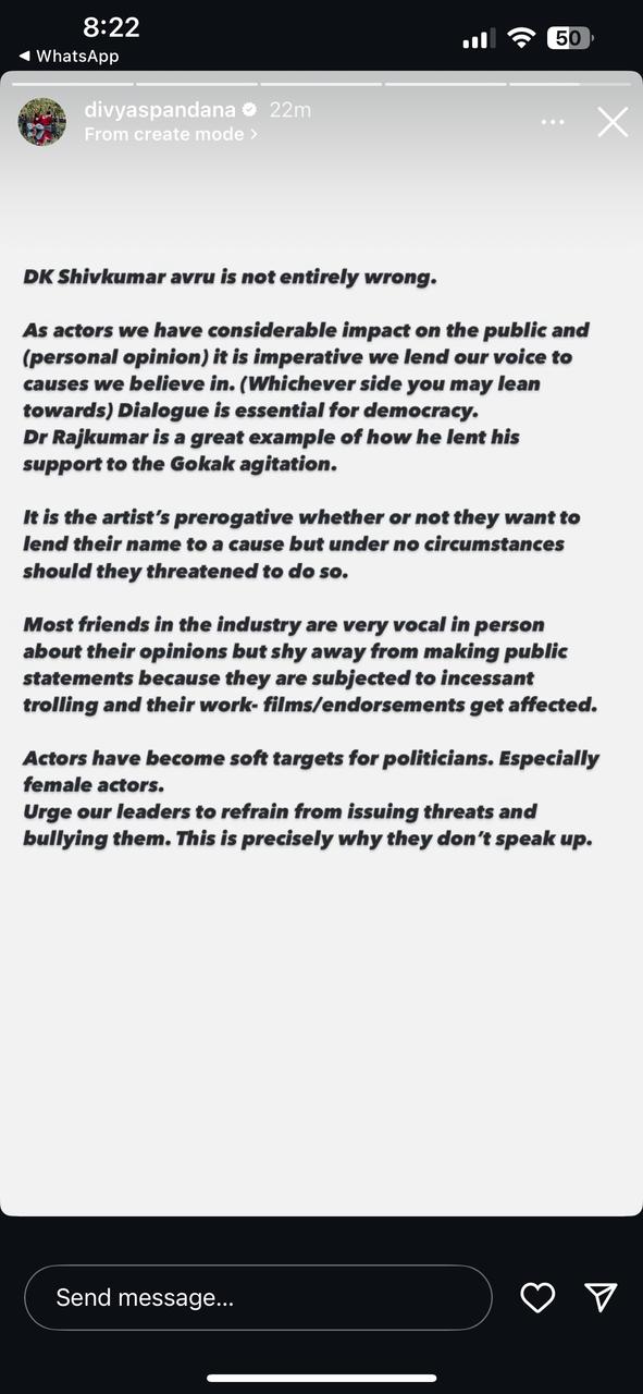 ಡಿಕೆ ಶಿವಕುಮಾರ್ ಅವರ ಹೇಳಿಕೆಗೆ ಪ್ರತಿಕ್ರಿಯಿಸಿ ರಮ್ಯಾ ಮೊದಲು ಬೆಂಬಲಿಸಿ ನಂತರ ಯು ಟರ್ನ್ ಹೊಡೆದಿದ್ದಾರೆ. ಕಲಾವಿದರು ರಾಜಕಾರಣಿಗಳ ಸಾಫ್ಟ್ ಟಾರ್ಗೆಟ್ ಆಗುತ್ತಿದ್ದಾರೆ ಎಂದು ರಮ್ಯಾ ಹೇಳಿದ್ದಾರೆ.