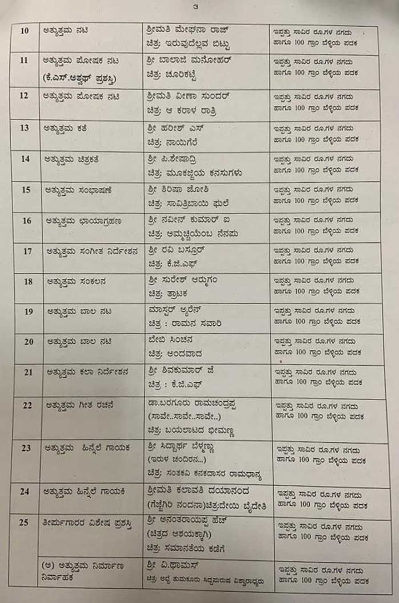 ಮೊದಲ ಅತ್ಯುತ್ತಮ ಚಿತ್ರ ಎಂದು ಡಿ ಪಿಕ್ಟರ್ಸ್ ನಿರ್ಮಾಣ ಹಾಗೂ ಶ್ರೀ ದಯಾಳ್ ಪದ್ಮನಾಭನ್ ಅವರ ನಿರ್ದೇಶನದ 'ಆ ಕರಾಳ ರಾತ್ರಿ' ಚಿತ್ರಕ್ಕೆ ದೊರಕಿದೆ. ವಿಶೇಷ ಸಾಮಾಜಿಕ ಕಾಳಜಿಯ ಚಿತ್ರ 'ಸಂತಕವಿ ಕನಕದಾಸರ ರಾಮಧಾನ್ಯ ಚಿತ್ರಕ್ಕೆ ದೊರಕಿದೆ. ಅತ್ಯುತ್ತಮ ಮನರಂಜನಾ ಚಿತ್ರ - ಸರ್ಕಾರಿ ಹಿರಿಯ ಪ್ರಾಥಮಿಕ ಶಾಲೆ ಕಾಸರಗೋಡು ಆಗಿದ್ದು ರಿಷಬ್ ಶೆಟ್ಟಿ ಪ್ರಶಸ್ತಿಗೆ ಆಯ್ಕೆಯಾಗಿದ್ದಾರೆ.