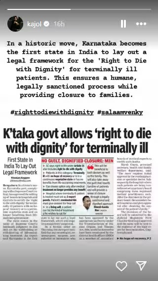 ಕರ್ನಾಟಕ ಸರ್ಕಾರದ 'ಘನತೆಯಿಂದ ಸಾಯುವ ಹಕ್ಕು' ನಿರ್ಧಾರಕ್ಕೆ ಕಾಜೋಲ್ ಬೆಂಬಲ ವ್ಯಕ್ತಪಡಿಸಿದ್ದಾರೆ. ಈ ಐತಿಹಾಸಿಕ ಕ್ರಮವು ಮಾರಕ ಕಾಯಿಲೆ ಪೀಡಿತರಿಗೆ ಕಾನೂನು ಚೌಕಟ್ಟನ್ನು ಒದಗಿಸುತ್ತದೆ ಎಂದು ಅವರು ಹೇಳಿದ್ದಾರೆ. 'ಸಲಾಮ್ ವೆಂಕಿ' ಚಿತ್ರದ ಸಂದೇಶಕ್ಕೆ ಈ ನಿರ್ಧಾರವನ್ನು ಜೋಡಿಸಿದ್ದಾರೆ.