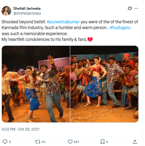 'ನನಗೆ ನಂಬಲು ಸಾಧ್ಯವೇ ಆಗದಿರುವಷ್ಟು ಶಾಕ್ ಆಯಿತು. ಕನ್ನಡ ಫಿಲ್ಮ್ ಇಂಡಸ್ಟ್ರಿಯನ್ನು ನಾನು ಕಂಡ ಅತ್ಯುತ್ತಮ ವ್ಯಕ್ತಿ ಪುನೀತ್ ರಾಜ್ಕುಮಾರ್. ಎಂತಹ ವಿನಮ್ರ ಮತ್ತು ಪ್ರೀತಿಯ ವ್ಯಕ್ತಿ. #hudugaru ಒಂದು ಸ್ಮರಣೀಯ ಅನುಭವವಾಗಿತ್ತು. ಅವರ ಕುಟುಂಬ ಮತ್ತು ಅಭಿಮಾನಿಗಳಿಗೆ ನನ್ನ ಹೃತ್ಪೂರ್ವಕ ಸಂತಾಪಗಳು.💔' ಎಂದು ಶೆಫಾಲಿ ಜರಿವಾಲಾ ಬರೆದುಕೊಂಡಿದ್ದರು.