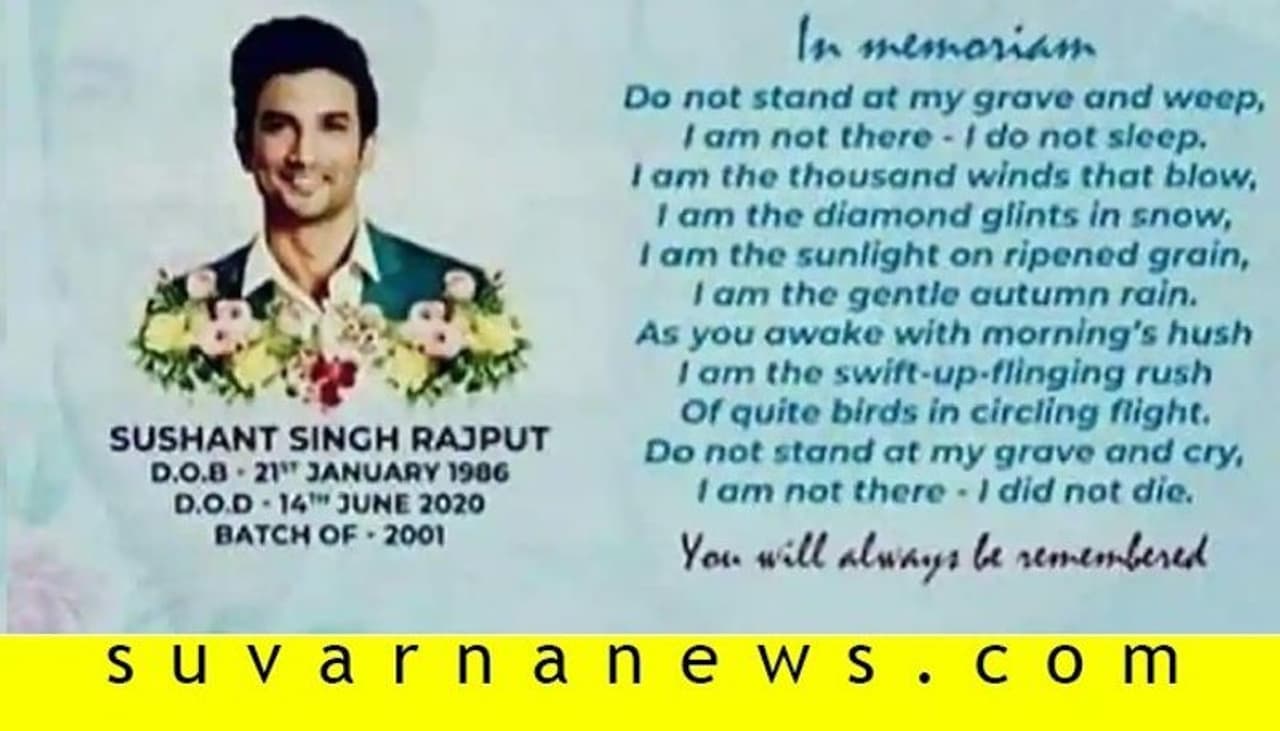 ಈ ಹಾಡನ್ನು ಸುಶಾಂತ್ ಫೋಟೋ ಜೊತೆಗೆ ಶೇರ್ ಮಾಡಲಾಗಿದೆ. ಸುಶಾಂತ್ ಸಿಂಗ್ ಜನನ ದಿನಾಂಕ ಮತ್ತು ಮರಣ ದಿನವನ್ನೂ ಬರೆದು, 2001ನೇ ಬ್ಯಾಚ್ ಎಂದು ನಮೂದಿಸಲಾಗಿದೆ.