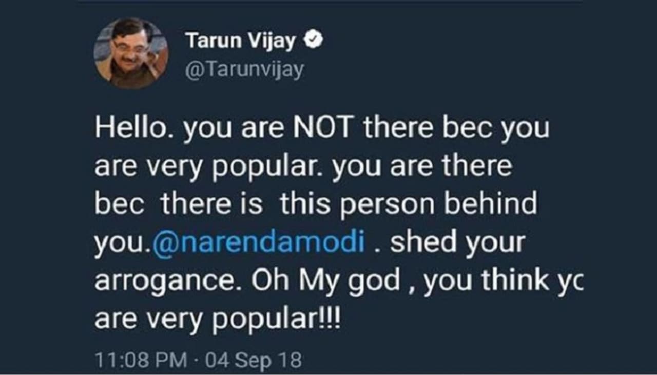 ತರುಣ್ ವಿಜಯ್ ಅವರ ಟ್ವಿಟ್ಟರ್ ಅಕೌಂಟ್ ನಲ್ಲಿ ಪ್ರಧಾನಿ ನರೇಂದ್ರ ಮೋದಿ ಕುರಿತು ಟೀಕೆ ಮಾಡಲಾಗಿತ್ತು. 'ಪ್ರಧಾನಿ ನೀವು ನಿಮ್ಮನ್ನು ಬಹಳ ಜನಪ್ರಿಯ ವ್ಯಕ್ತಿ ಎಂದು ಭಾವಿಸಿದ್ದರೆ ಅದು ನಿಮ್ಮ ತಪ್ಪು ಕಲ್ಪನೆ, ನಿಮ್ಮ ಜನಪ್ರಿಯತೆಯ ಹಿಂದೆ ಅಸಂಖ್ಯಾತ ಜನರ ಶ್ರಮ ಇದೆ. ನಿಮ್ಮ ಅಹಂಕಾರವನ್ನು ಬದಿಗಿರಿಸಿ' ಎಂದು ಬರೆಯಲಾಗಿತ್ತು.