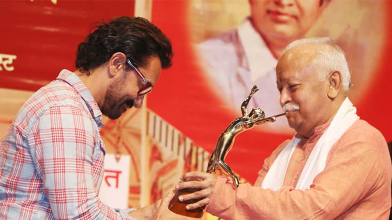 ಮುಂಬೈ(ಏ.25): ದೇಶದಲ್ಲಿ ಹೆಚ್ಚುತ್ತಿರುವ ಅಸಹಿಷ್ಣುತೆ ಬಗ್ಗೆ ಹೇಳಿಕೆ ನೀಡಿ ಹಿಂದುತ್ವ ಸಂಘಟನೆಗಳ ಕೆಂಗಣ್ಣಿಗೆ ಗುರಿಯಾಗಿದ್ದ ಖ್ಯಾತ ಬಾಲಿವುಡ್ ನಟ ಆಮೀರ್ ಖಾನ್'ಗೆ ಆರೆಸ್ಸೆಸ್ ಮುಖ್ಯಸ್ಥ ಮೋಹನ್ ಭಾಗವತ್ ಪ್ರಶಸ್ತಿ ಪ್ರದಾನ ಮಾಡಿದರು.