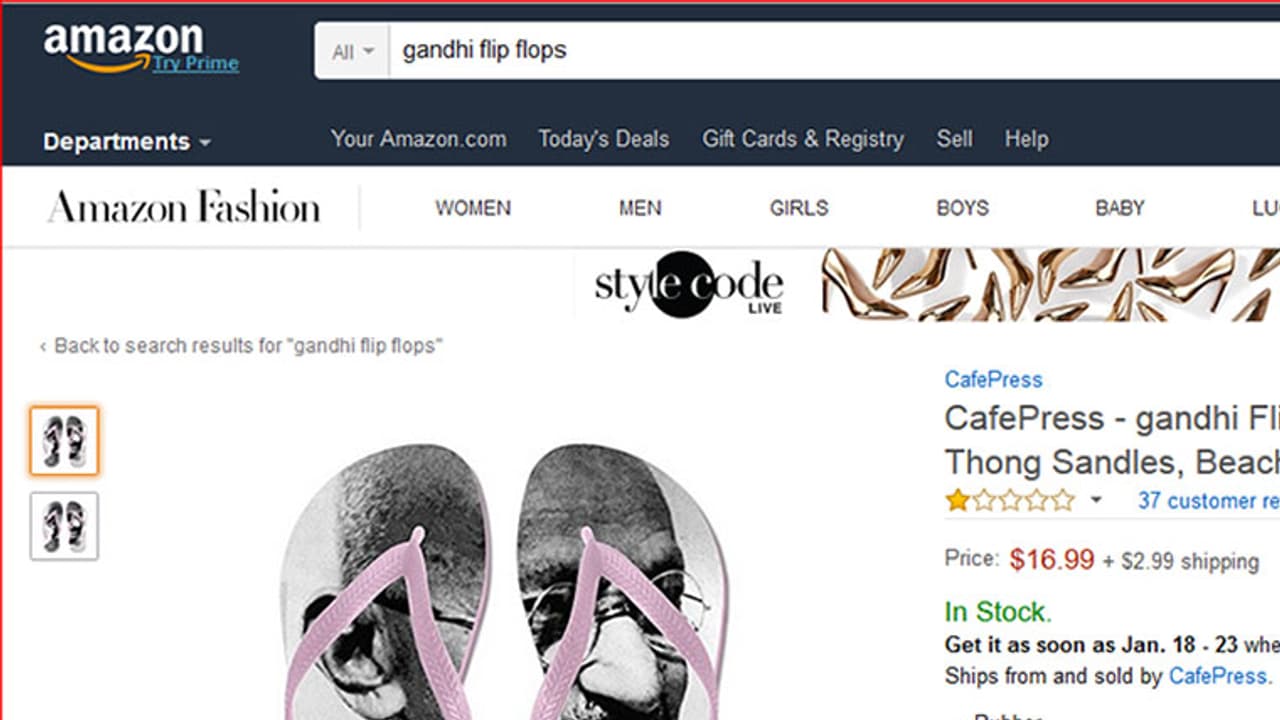 ಇದೀಗ ಅಮೆಜಾನ್ ಡಾಟ್ ಕಾಂ ಶಾಪಿಂಗ್ ಪೋರ್ಟಲ್ನಲ್ಲಿ ಮಹಾತ್ಮ ಗಾಂಧೀಜಿಯವರ ಚಿತ್ರವಿರುವ ಚಪ್ಪಲಿ ಮಾರಾಟಕ್ಕಿಡಲಾಗಿದೆ. ಅಮೆಜಾನ್ ಡಾಟ್ ಕಾಂ ಶಾಪಿಂಗ್ ಪೋರ್ಟಲ್'ನಲ್ಲಿ Gandhi Flip Flops ಗಾಂಧಿ ಚಿತ್ರವಿರುವ ಚಪ್ಪಲಿ ಮಾರಾಟಕ್ಕಿಟ್ಟಿದ್ದು ಇದರ ಬೆಲೆ 16.99 ಡಾಲರ್ ಅಂದರೆ 1157.44 ಆಗಿದೆ. ಇದು ತೀವ್ರ ವಿವಾದಕ್ಕೆ ಕಾರಣವಾಗಿದೆ.