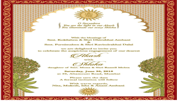 ಆಹ್ವಾನ ಪತ್ರಿಕೆಯಲ್ಲಿ ನವ ಜೋಡಿಗಳಾದ ಆಕಾಶ್ ಅಂಬಾನಿ ಮತ್ತು ಶ್ಲೋಕಾ ಮೆಹತಾ ಕಾಣಿಸಿಕೊಂಡಿದ್ದಾರೆ. ನಿಶ್ಚಿತಾರ್ಥ ಕಾರ್ಯಕ್ರಮ ಜೂ.30ರಂದು ನಡೆಯಲಿದ್ದು, ದಯವಿಟ್ಟು ಈ ದಿನಾಂಕವನ್ನು ಕಾದಿರಿಸಿಕೊಳ್ಳಿ ಎಂದು ಮುಕೇಶ್ ಮತ್ತು ನೀತಾ ಅಂಬಾನಿ ಮನವಿ ಮಾಡಿಕೊಂಡಿದ್ದಾರೆ.
