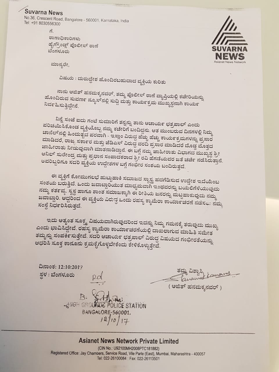 ಈ ಈಮೇಲ್ ದಾಖಲೆಯ ಸ್ಕ್ರೀನ್ ಶಾಟ್ ನೀಡಲಾಗಿದ್ದು, ಅದರಲ್ಲಿರುವ ದಿನಾಂಕ ಮತ್ತು ಸಮಯವನ್ನು ಗಮನಿಸಬಹುದು. It was an instant action.ಹೊರಗೆ ಹೋಗುವ ಆ ವ್ಯಕ್ತಿಯನ್ನು ಮತ್ತಷ್ಟು ಮಾತಿಗೆ ಎಳೆಯಲು ಯತ್ನಿಸಿದಾಗ, ಇದೀಗ ವಾಪಸ್ ಬರುತ್ತೇನೆ, ಪಕ್ಕದಲ್ಲೇ ಇರುವ ಇನ್ನೊಂದು ಟಿ.ವಿ. ಕಚೇರಿಯಲ್ಲಿ ಮೀಟಿಂಗ್ ಮುಗಿಸಿ ವಾಪಸ್ ಬರುವುದಾಗಿ ಆಚಾರ್ಯ ಛತ್ರಪಾಲ್ ಹೇಳಿದ್ದರಿಂದ ರಹಸ್ಯ ಕ್ಯಾಮೆರಾ ಸಲಕರಣೆಗಳೊಂದಿಗೆ ನಮ್ಮ ತಂಡ ಸಿದ್ಧವಾಗಿತ್ತು. ಆದರೆ, ಸದರಿ ವ್ಯಕ್ತಿ ಬರಲಿಲ್ಲ. ವಿಚಾರ ತುಸು ಸೆನ್ಸಿಟಿವ್ ಆಗಿರುವುದರಿಂದ ನಾವು ಸುವರ್ಣ ನ್ಯೂಸ್-ಕನ್ನಡ ಪ್ರಭ ಸಂಸ್ಥೆಗಳ ಪರವಾಗಿ ಮರುದಿನ ಬೆಳಿಗ್ಗೆಯೇ, ಅಂದರೆ, ಅಕ್ಟೋಬರ್ 12 ನೇ ತಾರೀಕು, 2017 ರ ಮುಂಜಾನೆಯೇ ಈ ಬಗ್ಗೆ ಬೆಂಗಳೂರಿನ ಹೈಗ್ರೌಂಡ್ಸ್ ಪೊಲೀಸ್ ಠಾಣೆಯಲ್ಲಿ ಆಚಾರ್ಯ ಛತ್ರಪಾಲ್ ಎಂದು ಹೇಳಿಕೊಂಡು ಬಂದ ವ್ಯಕ್ತಿಯ ವಿರುದ್ಧ ದೂರು ದಾಖಲಿಸಿದ್ದೇವೆ. ಈ ವ್ಯಕ್ತಿಗೆ ಕೋಮು ಸೌಹಾರ್ದತೆ ಕದಡುವ ಉದ್ದೇಶವಿದೆಯಾದ್ದರಿಂದ ನಾವು ಕುಟುಕು ಕಾರ್ಯಾಚರಣೆ ನಡೆಸುತ್ತೇವೆ. ಅಗತ್ಯ ಬಿದ್ದಲ್ಲಿ ಈತನ್ನು ವಶಕ್ಕೆ ಪಡೆದು ಕಾನೂನು ಕ್ರಮ ತೆಗೆದುಕೊಳ್ಳುವಂತೆ ದೂರು ನೀಡಿದ್ದೇವೆ. ದೂರಿನ ಪ್ರತಿ ಮತ್ತು ಪೊಲೀಸ್ ಠಾಣೆಯ ಸ್ವೀಕೃತಿ ಪತ್ರಗಳು ಇಲ್ಲಿವೆ.