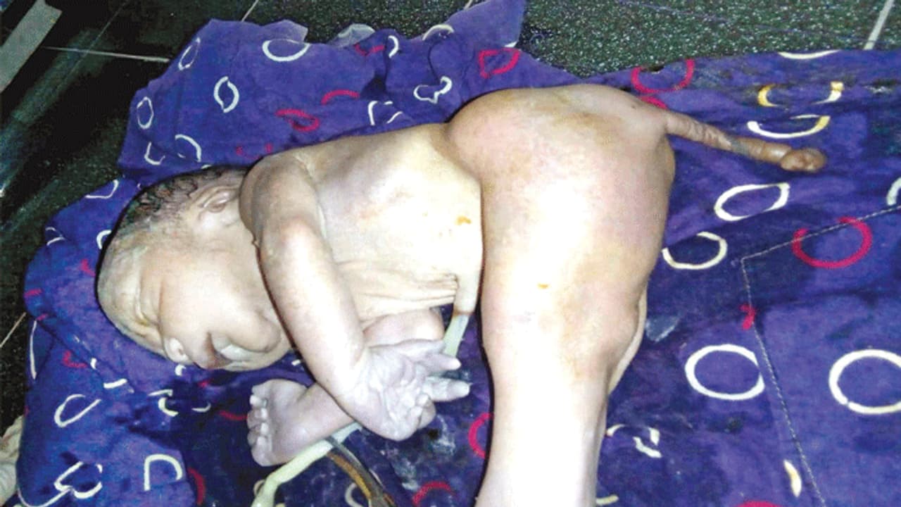 ಒಂದು ಕಾಲು ಮತ್ತು ಬಾಲ ಇರುವ ವಿಚಿತ್ರ ಮಗುವೊಂದು ಜನಿಸಿದ ಕೆಲ ನಿಮಿಷಗಳಲ್ಲಿಯೇ ಮೃತಪಟ್ಟಿರುವ ಘಟನೆ ಹಾಸನ ಜಿಲ್ಲೆ ಸಕಲೇಶಪುರ ತಾಲೂಕಿನಲ್ಲಿ ಸೋಮವಾರ ತಡರಾತ್ರಿ ನಡೆದಿದೆ.