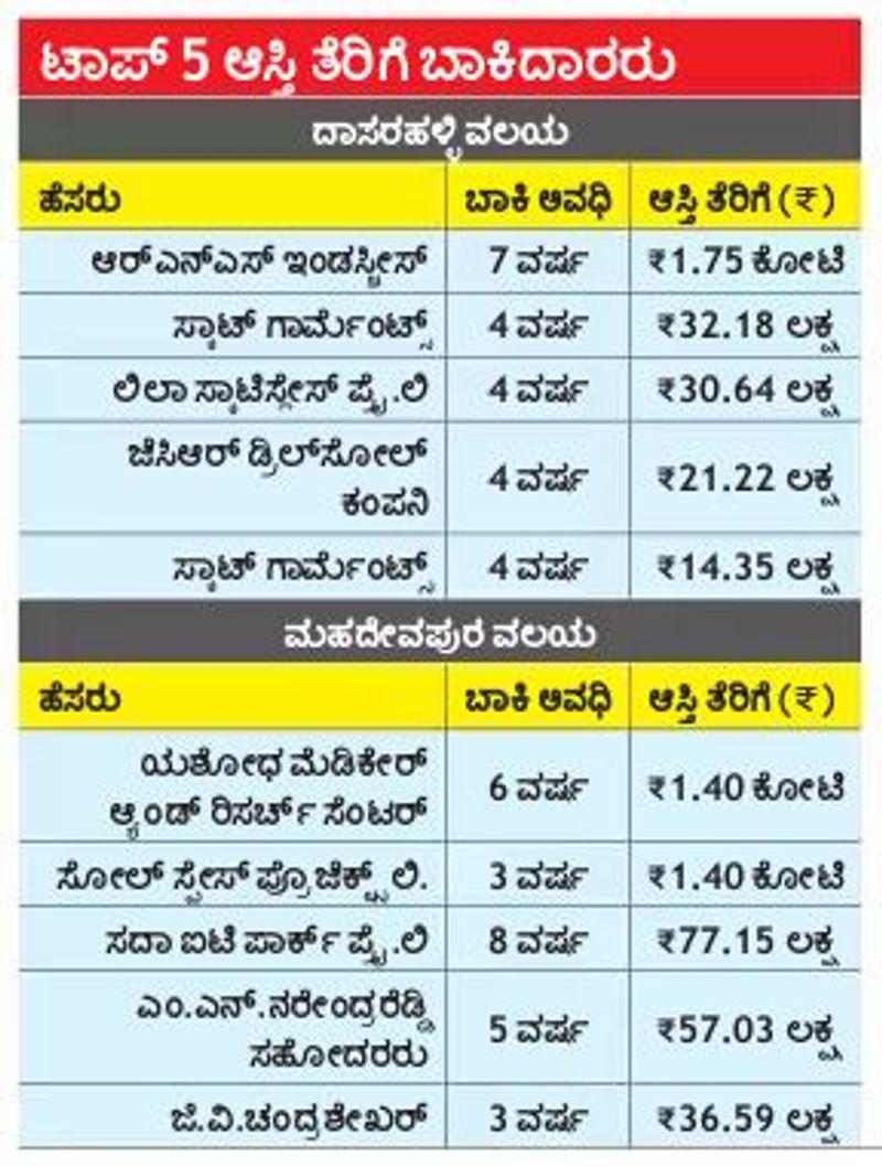 ಈವರೆಗೆ ಬಾಕಿ ಇರುವ ಆಸ್ತಿ ತೆರಿಗೆಯನ್ನು ಸಂಪೂರ್ಣವಾಗಿ ವಸೂಲಿ ಮಾಡುವುದು ಮತ್ತು ಆಸ್ತಿ ತೆರಿಗೆ ಸಂಗ್ರಹ ಗುರಿ ಸಾಧಿಸುವ ಉದ್ದೇಶದಿಂದ ವಲಯವಾರು ಅತಿ ಹೆಚ್ಚು ಆಸ್ತಿ ತೆರಿಗೆ ಬಾಕಿ ಉಳಿಸಿಕೊಂಡ ಮೊದಲ 100 ಮಂದಿ ಹೆಸರು ಬಹಿರಂಗ ಪಡಿಸಲಾಗುತ್ತಿದೆ.