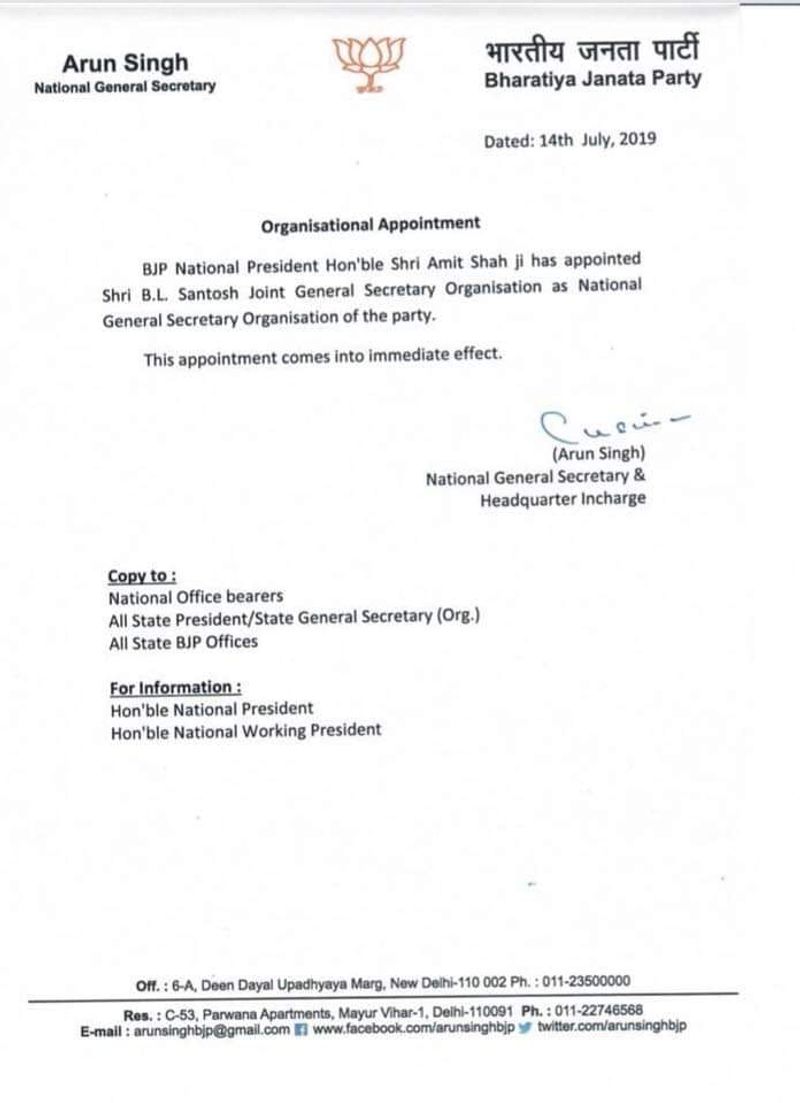 ದಕ್ಷಿಣ ಭಾರತದ ಬಿಜೆಪಿ ಸಂಘಟನಾ ಕಾರ್ಯದರ್ಶಿಯಾಗಿದ್ದ ಬಿ.ಎಲ್. ಸಂತೋಷ್ ಅವರನ್ನು ರಾಷ್ಟ್ರೀಯ ಕಾರ್ಯದರ್ಶಿಯಾಗಿ ಬಿಜೆಪಿ ರಾಷ್ಟ್ರೀಯ ಅಧ್ಯಕ್ಷ ಅಮಿತ್ ಶಾ ನೇಮಕ ಮಾಡಿದ್ದಾರೆ.