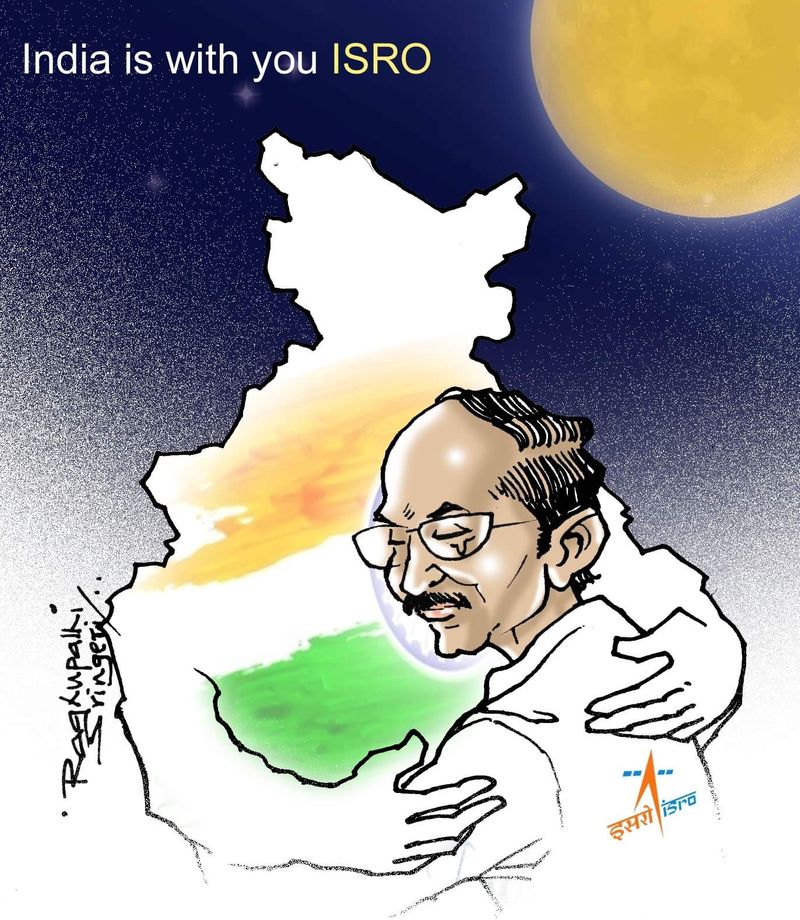 ಭಾರತೀಯರೆಲ್ಲರ ಭಾವನೆಯನ್ನು ಹಿಡಿದಿಟ್ಟಿರುವ ಈ ಕಾರ್ಟೂನ್ ನಲ್ಲಿ ತ್ರಿವರ್ಣ ಬಣ್ಣವಿರುವ ಭಾರತ ಇಸ್ರೋ ಮುಖ್ಯಸ್ಥ ಡಾ. ಕೆ. ಶಿವನ್ ರನ್ನು ಅಪ್ಪಿಕೊಂಡಿರುವ ದೃಶ್ಯವಿದೆ. ಇದರ ಜೊತೆ India Is With You ISRO ಎಂದೂ ಬರೆಯಲಾಗಿದೆ. ಇದು ಒಂದೆಡೆ 'ನಿಮ್ಮ ಸಾಧನೆ ಅಸಾಮಾನ್ಯ, ನಾವು ನಿಮ್ಮೊಂದಿಗಿದ್ದೇವೆ. ಕುಗ್ಗದಿರಿ, ಮತ್ತೆ ಪ್ರಯತ್ನಿಸಿ' ಎಂದ ಭಾರತೀಯರ ಒಕ್ಕೊರಲಿನ ಧ್ವನಿಯನ್ನು ಎತ್ತಿ ಹಿಡಿಯುತ್ತಿದ್ದರೆ, ಮತ್ತೊಂದೆಡೆ ಇಂದು ಶನಿವಾರ ಬೆಳಗ್ಗೆ ಪ್ರಧಾನಿ ಮೋದಿ ತಮ್ಮ ಭಾಷಣ ಮುಗಿದ ಬಳಿಕ ಅಳುತ್ತಿದ್ದ ಶಿವನ್ ರನ್ನು ತಬ್ಬಿ ಧೈರ್ಯ ತುಂಬಿರುವುದನ್ನೂ ನೆನಪಿಸುತ್ತದೆ.