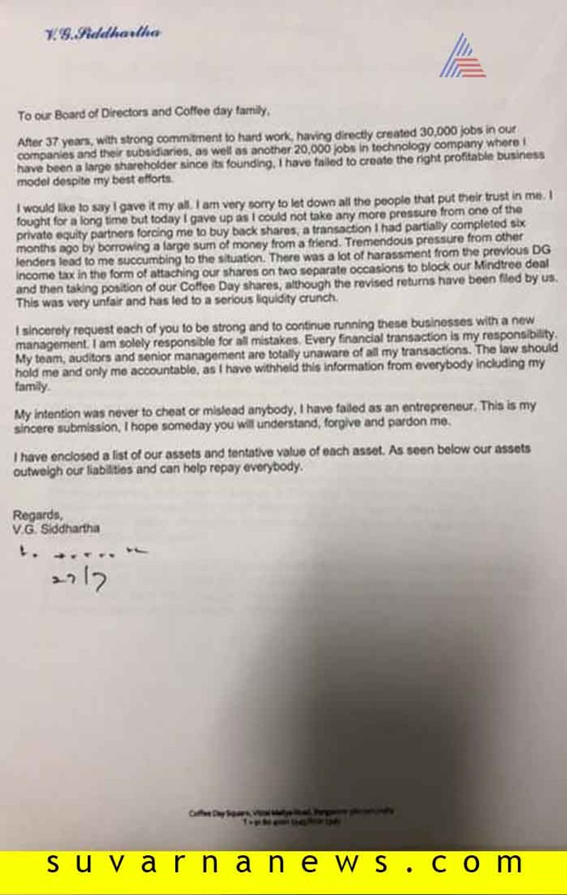 ಕಾಫಿ ಡೇ ಮಾಲೀಕ ಸಿದ್ಧಾರ್ಥ್ ಆತ್ಮಹತ್ಯೆ?| ಸಿದ್ಧಾರ್ಥ್ ಬರೆದಿಟ್ಟಿರುವ ಪತ್ರ ಸುವರ್ಣ ನ್ಯೂಸ್ಗೆ ಲಭ್ಯ| ಕಾಫಿ ಡೇ ನಿರ್ದೇಶಕರು, ಸಿಬ್ಬಂದಿಗೆ ಸಿದ್ಧಾರ್ಥ್ ಬರೆದಿರುವ ಪತ್ರ| ಸಾಲದ ಹೊಡೆತಕ್ಕೆ ನಲುಗಿರುವ ಬಗ್ಗೆ ಪತ್ರದಲ್ಲಿ ಸಿದ್ಧಾರ್ಥ್ ಉಲ್ಲೇಖ