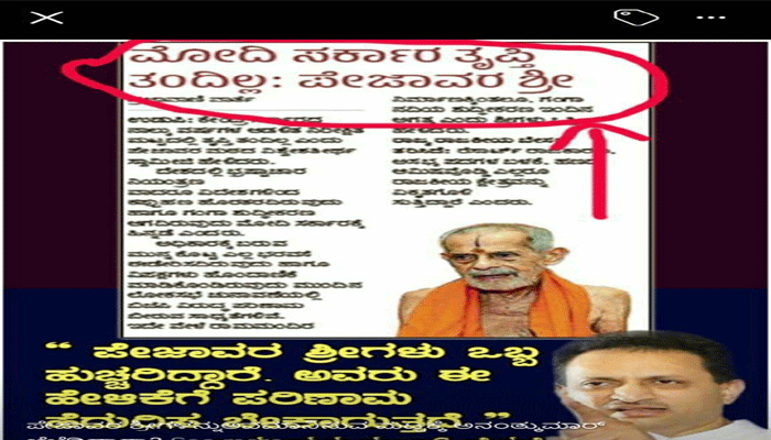 ಬೆಂಗಳೂರು : ಪ್ರಧಾನಿ ನರೇಂದ್ರ ಸರ್ಕಾರದ ಕೆಲಸ ತೃಪ್ತಿ ತಂದಿಲ್ಲ ಎಂದು ಪೇಜಾವರ ಶ್ರೀಗಳು ನೀಡಿದ್ದ ಹೇಳಿಕೆಗೆ ಕೇಂದ್ರ ಸಚಿವ ಅನಂತ್ ಕುಮಾರ್ ಹೆಗಡೆ ಅವರು 'ಶ್ರೀಗಳ ಬಗ್ಗೆ ಅವಹೇಳನಕಾರಿ ಹೇಳಿಕೆ' ನೀಡಿ ಪ್ರತಿಕ್ರಿಯಿಸಿದ್ದಾರೆ ಎಂದು ವ್ಯಕ್ತಿಯೊಬ್ಬ ಫೋಟೋವೊಂದನ್ನು ತಿರುಚಿ ಪೊಸ್ಟ್ ಮಾಡಿದ್ದಾರೆ.