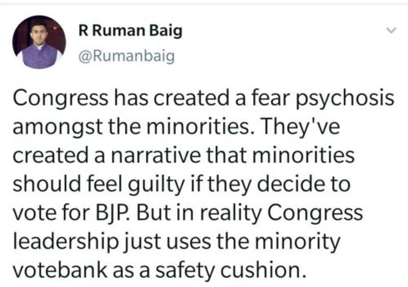 ರೋಷನ್ ಬೇಗ್ ವಿವಾದಾತ್ಮಕ ಹೇಳಿಕೆ ಬೆನ್ನಲ್ಲೇ ಅವರ ಪುತ್ರ ರುಮಾನ್ ಬೇಗ್ ಕೂಡಾ ಕಾಂಗ್ರೆಸ್ ವಿರುದ್ಧ ಅಸಮಾಧಾನ ಹೊರಹಾಕಿದ್ದಾರೆ. ಕಾಂಗ್ರೆಸ್ ನಾಯಕತ್ವದಲ್ಲಿ ಅಲ್ಪಸಂಖ್ಯಾತರು ಕೇವಲ ವೋಟ್ ಬ್ಯಾಂಕ್ ಆಗಿದ್ದಾರೆ. ಅಲ್ಪಸಂಖ್ಯಾತರ ನಡುವೆ ಕಾಂಗ್ರೆಸ್ ಭಯದ ಮನೋವಿಕಾರವನ್ನು ಸೃಷ್ಟಿಸಿದೆ ಎಂದು ಟ್ವೀಟ್ ಮಾಡುವ ಮೂಲಕ ಕಾಂಗ್ರೆಸ್ ವಿರುದ್ಧ ಆಕ್ರೋಶ ಹೊರಹಾಕಿದ್ದಾರೆ.