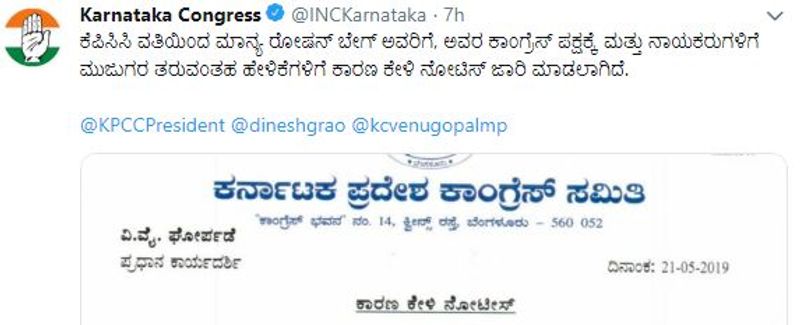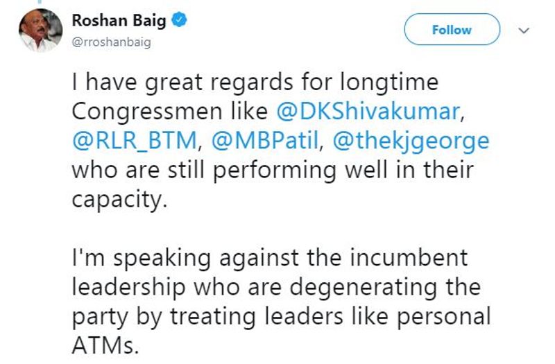 ಇಷ್ಟಕ್ಕೆ ಸುಮ್ಮನಾಗದ ರೋಷನ್ ಬೇಗ್, ಡಿಕೆ ಶಿವಕುಮಾರ್, ಎಂ.ಬಿ ಪಾಟೀಲ್ ಹಾಗೂ ಕೆ.ಜೆ ಜಾರ್ಜ್ ಅಭಿನಂದನೆಗೆ ಅರ್ಹರು. ಇವರು ಬಹು ಕಾಲದಿಂದ ತಮ್ಮ ಸ್ವಂತ ಶಕ್ತಿ ಮೇಲೆ ಇನ್ನೂ ಪಕ್ಷಕ್ಕಾಗಿ ಕೆಲಸ ಮಾಡ್ತಿದ್ದಾರೆ. ಆದ್ರೆ ನಾನು ಮಾತಾಡಿದ್ದು ಪಕ್ಷವನ್ನ ದುರಾಡಳಿತದಿಂದ ಹಾಳುಗೆಡವುತ್ತಿರೋ ನಾಯಕರ ಕುರಿತು. ಈ ದುರಾಡಳಿತದ ನಡೆಸುತ್ತಿರೋ ನಾಯಕರು ಪಕ್ಷದ ಮುಖಂಡರನ್ನ ಎಟಿಎಂ ಹಾಗೇ ಬಳಸಿಕೊಳ್ತಿದ್ದಾರೆ ಅಂತಾ ರೋಷನ್ ಬೇಗ್ ಟ್ವೀಟ್ ಮಾಡಿದ್ದಾರೆ.