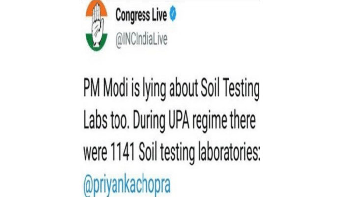 ಪ್ರಧಾನಿ ನರೇಂದ್ರ ಮೋದಿ ನೇತೃತ್ವದ ಕೇಂದ್ರ ಸರ್ಕಾರ ಮಣ್ಣು ಪರೀಕ್ಷೇ ಲ್ಯಾಬ್ ತೆರೆಯುವುದಾಗಿ ಹೇಳಿ ಇದೀಗ ಮಣ್ಣು ಪರೀಕ್ಷೆ ಕೇಂದ್ರವನ್ನು ತೆರೆಯದೇ ರೈತರಿಗೆ ಸುಳ್ಳು ಹೇಳಿದೆ ಎಂದು ಟ್ವೀಟ್ ಮಾಡಿ ಬಳಿಕ ಆ ಟ್ವೀಟ್ ಅನ್ನು ಪ್ರಿಯಾಂಕ ಚೋಪ್ರಾಗೆ ಟ್ಯಾಗ್ ಮಾಡಿದೆ.
