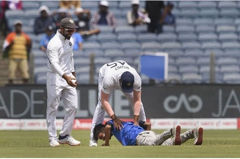 ಪುಣೆ ಟೆಸ್ಟ್ ಪಂದ್ಯದಲ್ಲಿ ರೋಹಿತ್ ಶರ್ಮಾ ಅಭಿಮಾನಿ, ಸೆಕ್ಯೂರಿಟಿ ನಿಯಮ ಉಲ್ಲಂಘಿಸಿ ಮೈದಾನದೊಳಕ್ಕೆ ಪ್ರವೇಶಿಸಿದ ಘಟನೆ ನಡೆದಿದೆ. ಈ ಘಟನೆಯಿಂದ ಟೀಂ ಇಂಡಿಯಾ ಹಾಗೂ ಸೆಕ್ಯೂಟಿ ಗಾರ್ಡ್ಗಳು ಒಂದು ಕ್ಷಣ ಬೆಚ್ಚಿ ಬಿದ್ದರು.