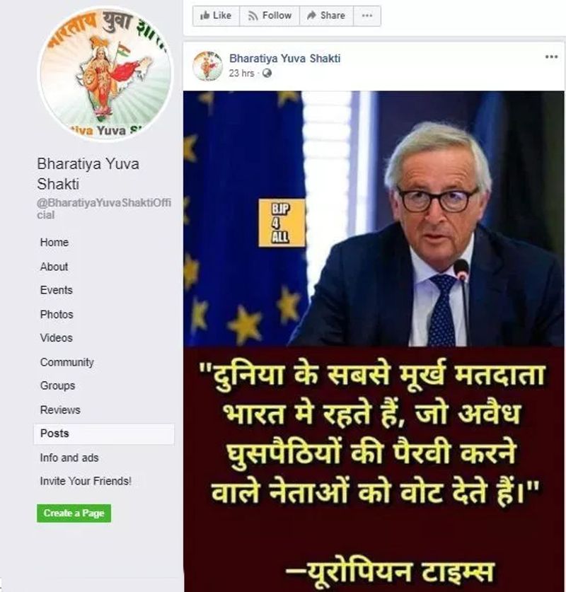 ‘ಯುರೋಪಿಯನ್ ಟೈಮ್ಸ್ ಎಂಬ ದಿನಪತ್ರಿಕೆ ವಿಶ್ವದಲ್ಲಿಯೇ ಅತಿ ಮೂರ್ಖ ಮತದಾರರು ಭಾರತದಲ್ಲಿದ್ದಾರೆ’ ಎಂದು ವರದಿ ಮಾಡಿದೆ ಎಂಬ ಸಂದೇಶವೊಂದು ಸಾಮಾಜಿಕ ಜಾಲತಾಣಗಳಲ್ಲಿ ಹರಿದಾಡುತ್ತಿದೆ. ಯುರೋಪಿಯನ್ ಕಮಿಷನ್ ಅಧ್ಯಕ್ಷ ಜೀನ್-ಕ್ಲೂಡೆ ಜಂಕರ್ ಅವರ ಫೋಟೋದೊಂದಿಗೆ,‘ವಿಶ್ವದ ಅತಿ ಮೂರ್ಖ ಮತದಾರರು ಭಾರತದಲ್ಲಿದ್ದಾರೆ. ಅವರು ಅಕ್ರಮಗಳಿಗೆ ಲಾಭಿ ಮಾಡುವವರಿಗೆ ಮತ ಹಾಕುತ್ತಾರೆ-ಯುರೋಪಿಯನ್ ಟೈಮ್ಸ್’ ಎಂದು ಬರೆದು ಪೋಸ್ಟ್ ಮಾಡಲಾಗಿದೆ. ಇದನ್ನು ಸಾವಿರಾರು ಜನರು ಈ ಸಂದೇಶವನ್ನು ಶೇರ್ ಮಾಡಿದ್ದಾರೆ. ಫೋಟೋದಲ್ಲಿ ‘ಬಿಜೆಪಿ4 ಆಲ್’ ಎಂಬ ಲೋಗೋ ಕೂಡ ಇದೆ. ಮತ್ತೆ ಕೆಲವು ಪೋಸ್ಟ್ಗಳಲ್ಲಿ ಈ ಸಂದೇಶದ ಜೊತೆಗೆ ರೊಹಿಂಗ್ಯಾಗಳ ಹೆಸರನ್ನೂ ಸೇರಿಸಿ ಶೇರ್ ಮಾಡಲಾಗಿದೆ.