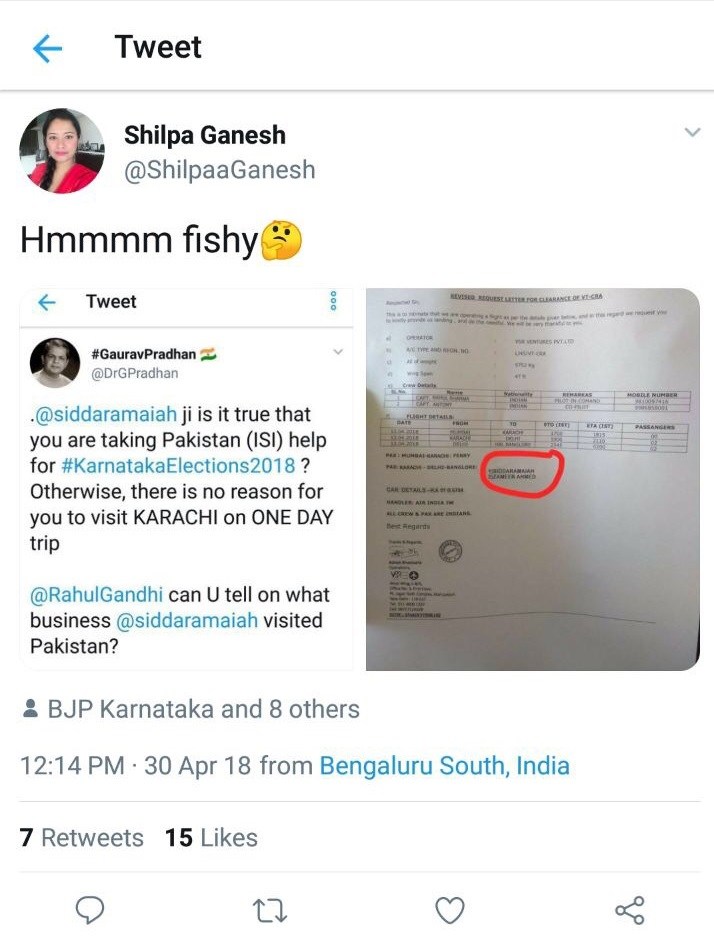 ಸಿಎಂ ಸಿದ್ದರಾಮಯ್ಯ ಏ.13ಕ್ಕೆ ಪಾಕಿಸ್ತಾನಕ್ಕೆ ಭೇಟಿ ನೀಡಿದ್ದರು ಎಂಬ ಸುಳ್ಳು ಸುದ್ದಿ ಹರಡಿಸಿದ ದುಷ್ಕರ್ಮಿಗಳು! ಪೋಸ್ಟನ್ನು ರೀಟ್ವೀಟ್ ಮಾಡಿದ ಬಿಜೆಪಿ ನಾಯಕಿ ಶಿಲ್ಪಾ ಗಣೇಶ್?!
