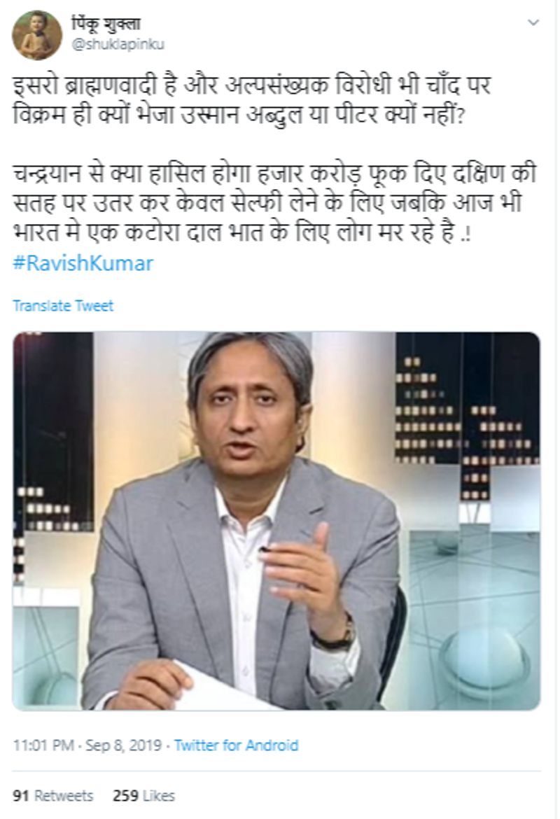 ಪತ್ರಕರ್ತ ರವೀಶ್ ಕುಮಾರ್ ಭಾರತೀಯ ಬಾಹ್ಯಾಕಾಶ ಸಂಶೋಧನಾ ಸಂಸ್ಥೆ (ಇಸ್ರೋ) ಮೇಲ್ವರ್ಗದ್ದು ಎಂದು ಆರೋಪಿಸಿ ಹೇಳಿಕೆ ನೀಡಿದ್ದಾರೆ ಎಂಬ ಹೇಳಿಕೆಯೊಂದು ಸಾಮಾಜಿಕ ಜಾಲತಾಣಗಳಲ್ಲಿ ವೈರಲ್ ಆಗುತ್ತಿದೆ. ಇದು ನಿಜಾನಾ? ಇಲ್ಲಿದೆ ಸುದ್ದಿ ಹಿಂದಿನ ಸತ್ಯಾ ಸತ್ಯತೆ