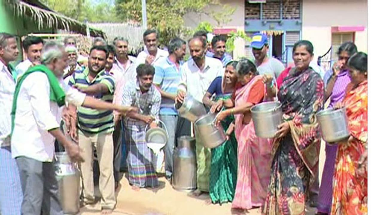 ತುಮಕೂರು(ನ.30): ಹಾಲಿಗೆ ನೀಡುತ್ತಿರುವ ದರ ಹೆಚ್ಚಿಸಬೇಕೆಂದು ಆಗ್ರಹಿಸಿ ಹಾಲನ್ನು ಚೆಲ್ಲುವ ಮೂಲಕ ತಿಪಟೂರು ತಾಲೂಕಿನ ರೈತರು ವಿಭಿನ್ನ ಪ್ರತಿಭಟನೆ ನಡೆಸಿದರು.