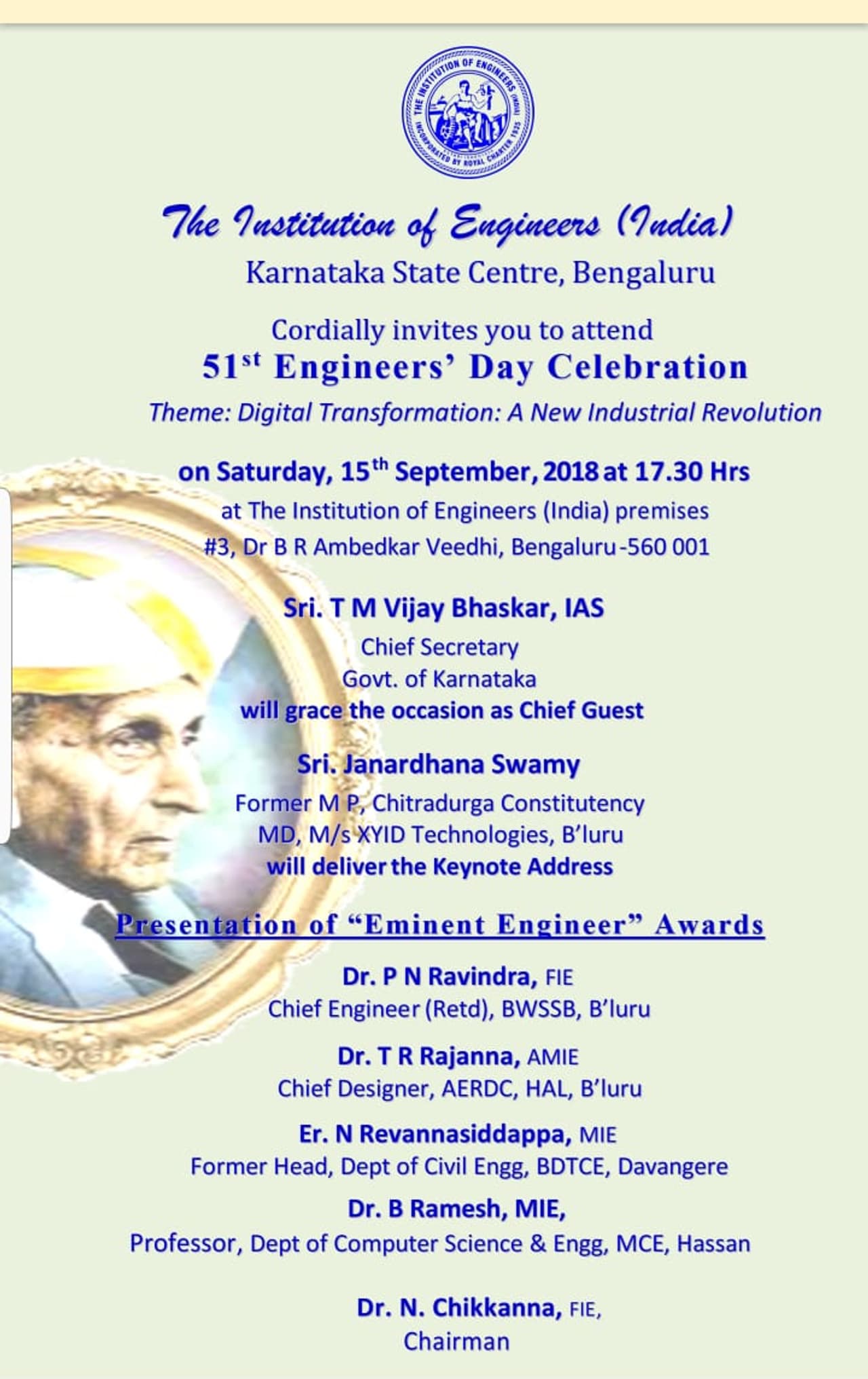 ಬೆಂಗಳೂರು[ಸೆ.12] ಸರ್ .ಎಂ.ವಿಶ್ವೇಶರಯ್ಯ ಅವರ ಜನ್ಮದಿನವನ್ನು ಇಂಜಿನಿಯರ್ಸ್ ಡೇ ಆಗಿ ಆಚರಣೆ ಮಾಡಿಕೊಂಡು ಬರಲಾಗುತ್ತಿದೆ. ನಗರದ ಅಂಬೇಡ್ಕರ್ ವೀದಿಯ ದಿ ಇನ್ಸ್ಟಿಟ್ಯೂಷನ್ ಆಫ್ ಇಂಜಿನಿಯರ್ಸ್ ಆವರಣದಲ್ಲಿ ಸೆ.15 ರಂದು ಸಂಜೆ 5.30ಕ್ಕೆ ಇಂಜಿನಿಯರ್ಸ್ ದಿನಾಚರಣೆ ಹಮ್ಮಿಕೊಳ್ಳಲಾಗಿದೆ.