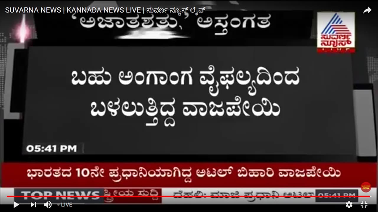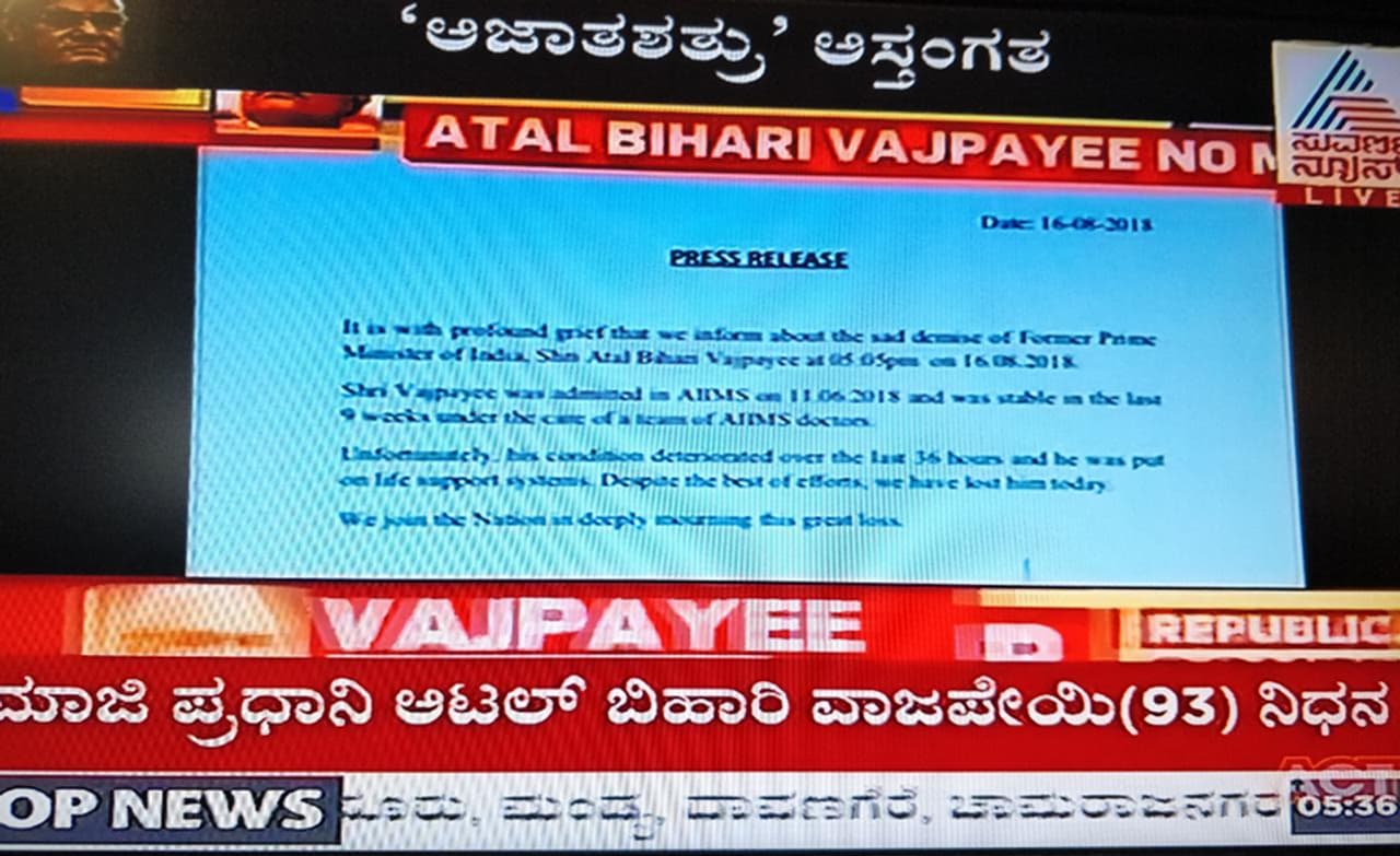 ಮಾಜಿ ಪ್ರಧಾನಿ ಅಟಲ್ ಬಿಹಾರಿ ವಾಜಪೇಯಿ ವಿಧಿವಶ! ಬಹು ಅಂಗಾಂಗ ವೈಫಲ್ಯದಿಂದ ಬಳಲುತ್ತಿದ್ದ ವಾಜಪೇಯಿ! ದೆಹಲಿಯ ಏಮ್ಸ್ ಆಸ್ಪತ್ರೆಯಲ್ಲಿ ನಿಧನ! ಏಮ್ಸ್ ವೈದ್ಯರ ಅಧಿಕೃತ ಘೋಷಣೆ! ವಾಜಪೇಯಿ ನಿಧನಕ್ಕೆ ಕಂಬನಿ ಮಿಡಿದ ದೇಶ