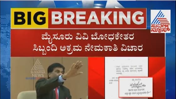 ಮೈಸೂರು ವಿವಿಯಲ್ಲಿ ಅಕ್ರಮವಾಗಿ ನೇಮಕಗೊಂಡ ಎಲ್ಲಾ ಬೋಧಕೇತರ ಸಿಬ್ಬಂದಿಯನ್ನು ವಜಾಗೊಳಿಸುವಂತೆ ಆದೇಶ ನೀಡಲಾಗಿದೆ. ಸರ್ಕಾರದ ಪ್ರಧಾನ ಕಾರ್ಯದರ್ಶಿ ಮೈಸೂರು ವಿವಿಗೆ ಪತ್ರ ಬರೆದಿದ್ದಾರೆ. ಪ್ರೋ. ಕೆ.ಎಸ್ ರಂಗಪ್ಪ ಕುಲಪತಿಯಾಗಿದ್ದ ವೇಳೆ ನಡೆದ ಎಲ್ಲಾ ಅಕ್ರಮ ನೇಮಕಾತಿಯನ್ನು ವಜಾಗೊಳಿಸುವಂತೆ ಆದೇಶಿಸಲಾಗಿದೆ.