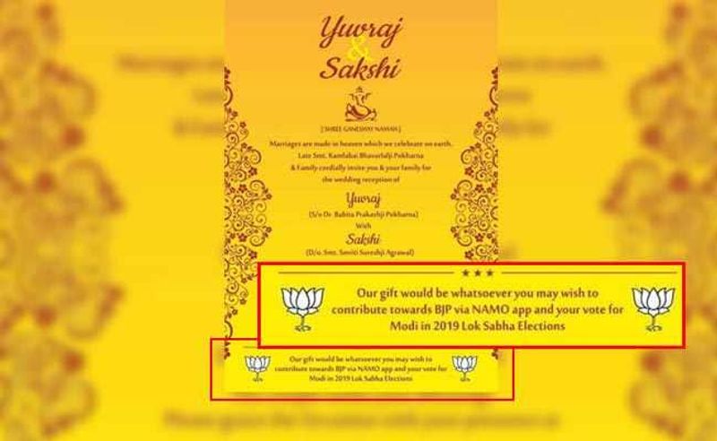 ಮದುವೆ ಆಮಂತ್ರಣದಲ್ಲಿ ರಫೇಲ್ ಒಪ್ಪಂದ ಸಮರ್ಥನೆ! ಯುವರಾಜ್ ಹಾಗೂ ಸಾಕ್ಷಿ ಎಂಬ ಜೋಡಿ ಜ.22ರಂದು ವಿವಾಹ ಆಗುತ್ತಿದ್ದು, ಮದುವೆ ಆಮಂತ್ರಣ ಪತ್ರಿಕೆಯಲ್ಲಿ ಮೋದಿಯನ್ನು ನಂಬಿ ಎಂದು ವಿನಂತಿಸಿಕೊಂಡಿದ್ದಾರೆ.