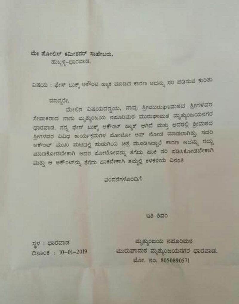 ಧಾರವಾಡ [ಜ.11] ಮೃತ್ಯುಂಜಯ ಮುರುಘಾಮಠದ ಸ್ವಾಮೀಜಿಗಳ ಫೇಸ್ಬುಕ್ ಅಕೌಂಟ್ ಹ್ಯಾಕ್ ಆಗಿದೆ. ಸ್ವಾಮಿಗಳ ಅಕೌಂಟ್ ಹ್ಯಾಕ್ ಮಾಡಿದ ಕಿರಾತಕರು ಮಹಿಳೆಯ ಫೋಟೋ ಒಂದನ್ನು ಅಪ್ಲೋಡ್ ಮಾಡಿದ್ದಾರೆ.