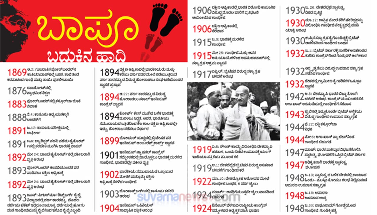 ಮಹಾತ್ಮ ಗಾಂಧಿಜೀ ಜನಿಸಿದ್ದು ಅಕ್ಟೋಬರ್ 2, 1869ರಂದು. 1948 ಜನವರಿ 30ರಂದು ಅವರ ಹತ್ಯೆಯಾಯಿತು. ಬಾಪೂವಿನ ಜೀವನದಲ್ಲಿ ಪ್ರತಿ ದಿನ, ಪ್ರತಿ ವರ್ಷ ಬಹಳ ಮಹತ್ವಕಾರಿಯಾಗಿತ್ತು. ರಾಷ್ಟ್ರಪಿತನ ಬದುಕಿನ ಹಾದಿಯ ಒಂದು ನೋಟ ಇಲ್ಲಿದೆ.