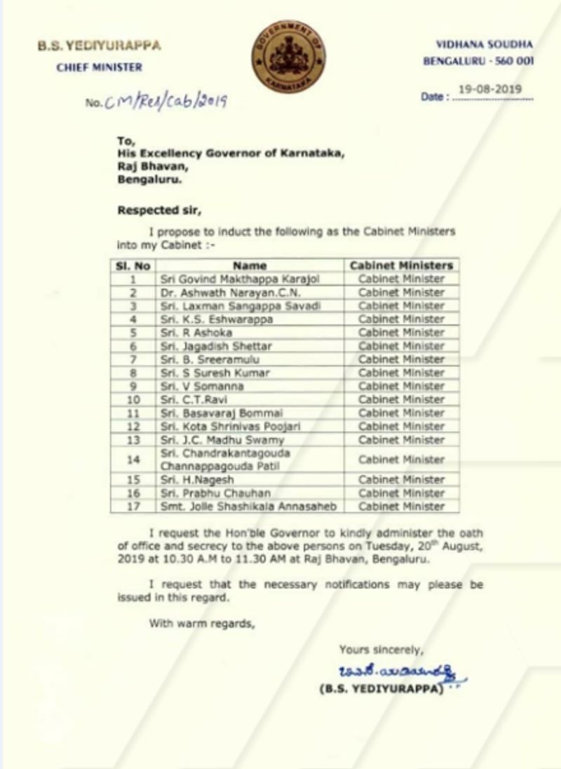 ಬಿ. ಎಸ್. ಯಡಿಯೂರಪ್ಪ ಸಚಿವ ಸಂಪುಟದಲ್ಲಿ 17 ಶಾಸಕರಿಗೆ ಮೊದಲ ಹಂತದಲ್ಲಿ ಮಂತ್ರಿಗಿರಿ ಭಾಗ್ಯ| 17 ಮಂದಿಯ ಅಧಿಕೃತ ಪಟ್ಟಿ ಬಿಡುಗಡೆ| ಅಮಿತ್ ಶಾ ಫೈನಲ್ ಮಾಡಿದ ಪಟ್ಟಿಯಲ್ಲಿ ಯಾರಿಗೆಲ್ಲಾ ಸಿಕ್ಕಿದೆ ಮಂತ್ರಿ ಭಾಗ್ಯ?